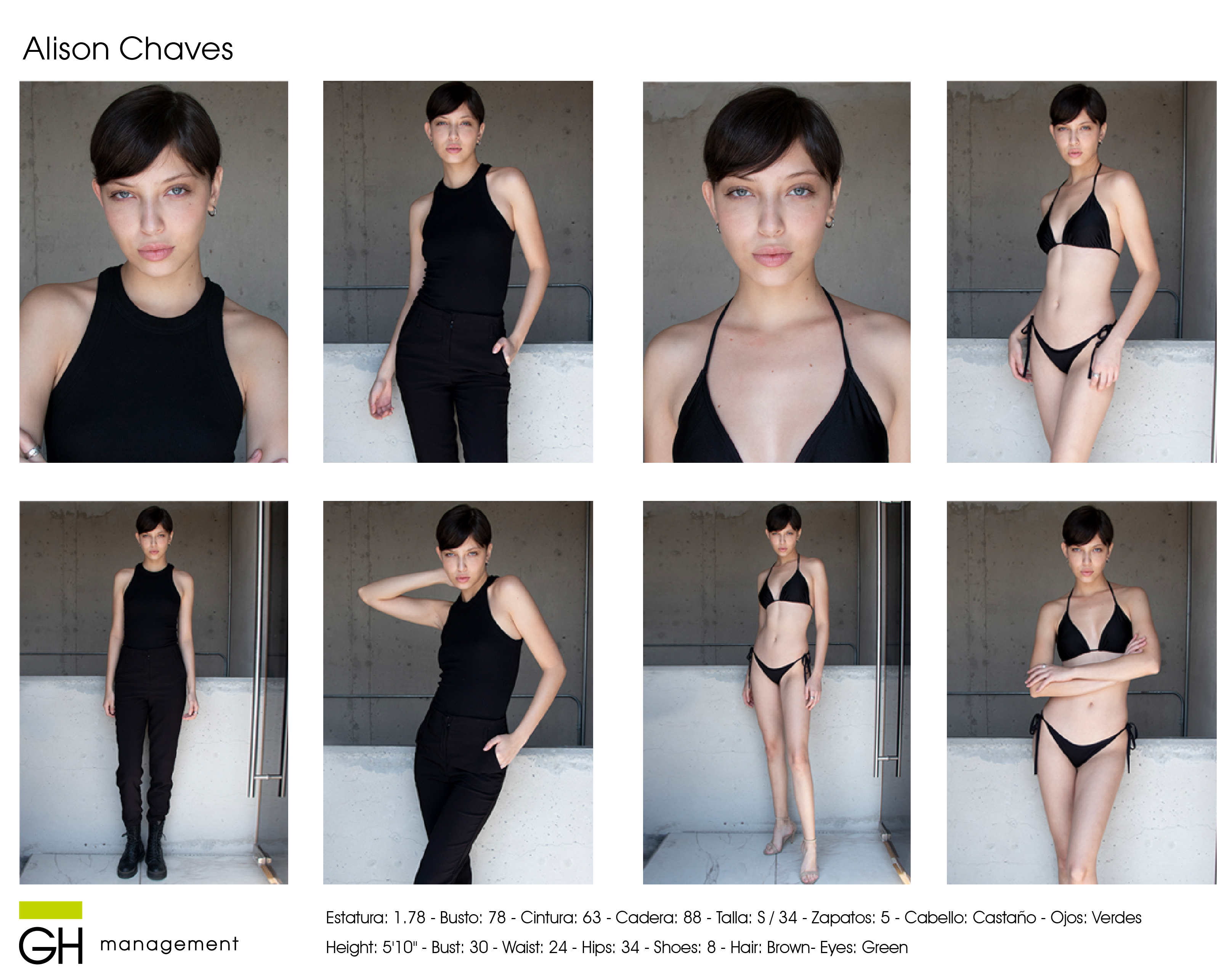Estatura: 1.78 - Busto: 78 - Cintura: 63 - Cadera: 88 - Zapatos: 5 - Cabello: CastaƱo - Ojos: Verdes