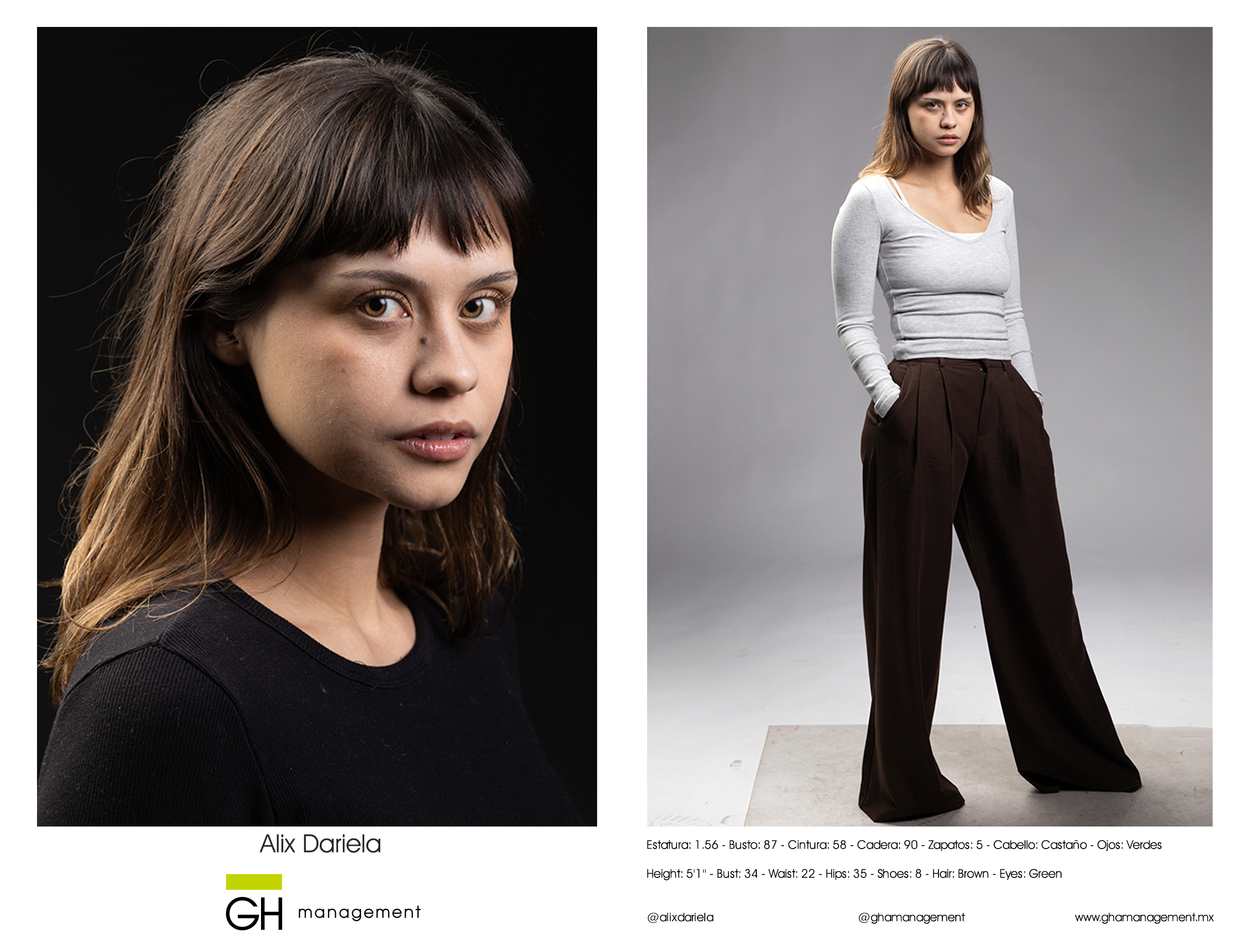 Estatura: 1.56 - Busto: 87 - Cintura: 58 - Cadera: 90 - Zapatos: 5 - Cabello: CastaƱo - Ojos: Verdes