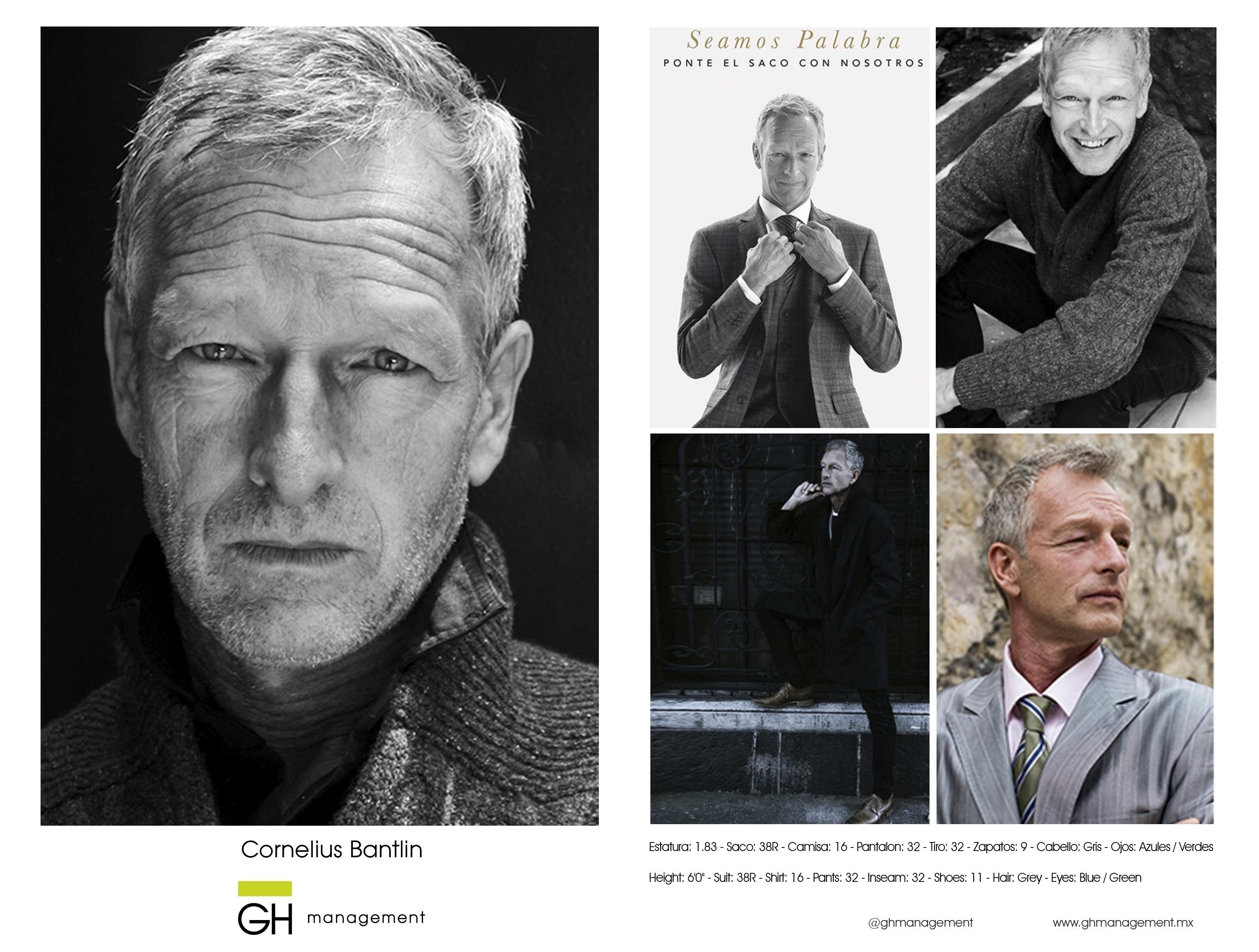 Estatura: 1.83 - Saco: 38R - Camisa: 16 - Pantalon: 32 - Tiro: 32 - Zapatos: 9 - Cabello: Gris - Ojos: Azules / Verdes