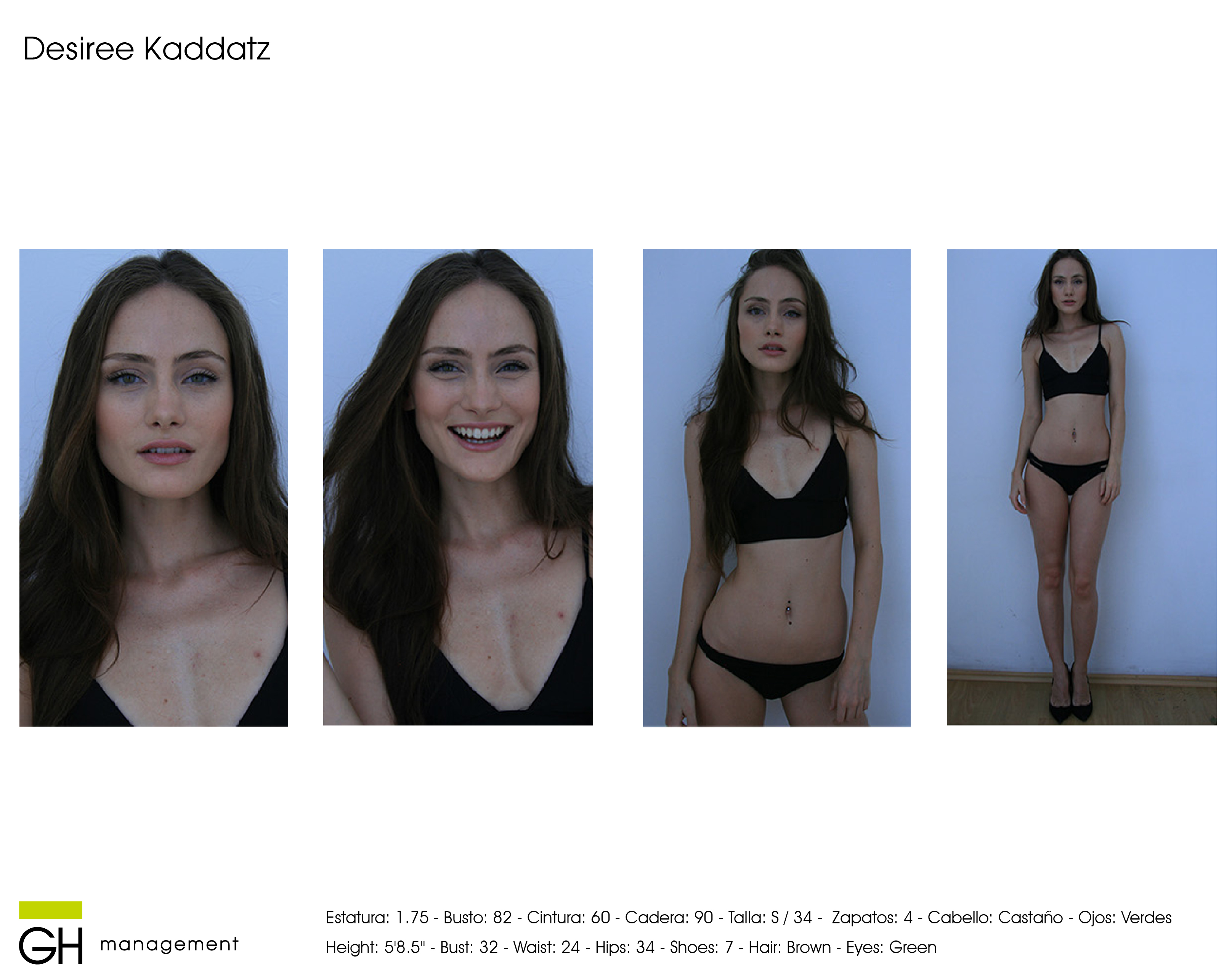 Height: 5'8.5'' - Bust: 32 - Waist: 24 - Hips: 34 - Shoes: 7 - Hair: Brown - Eyes: Green