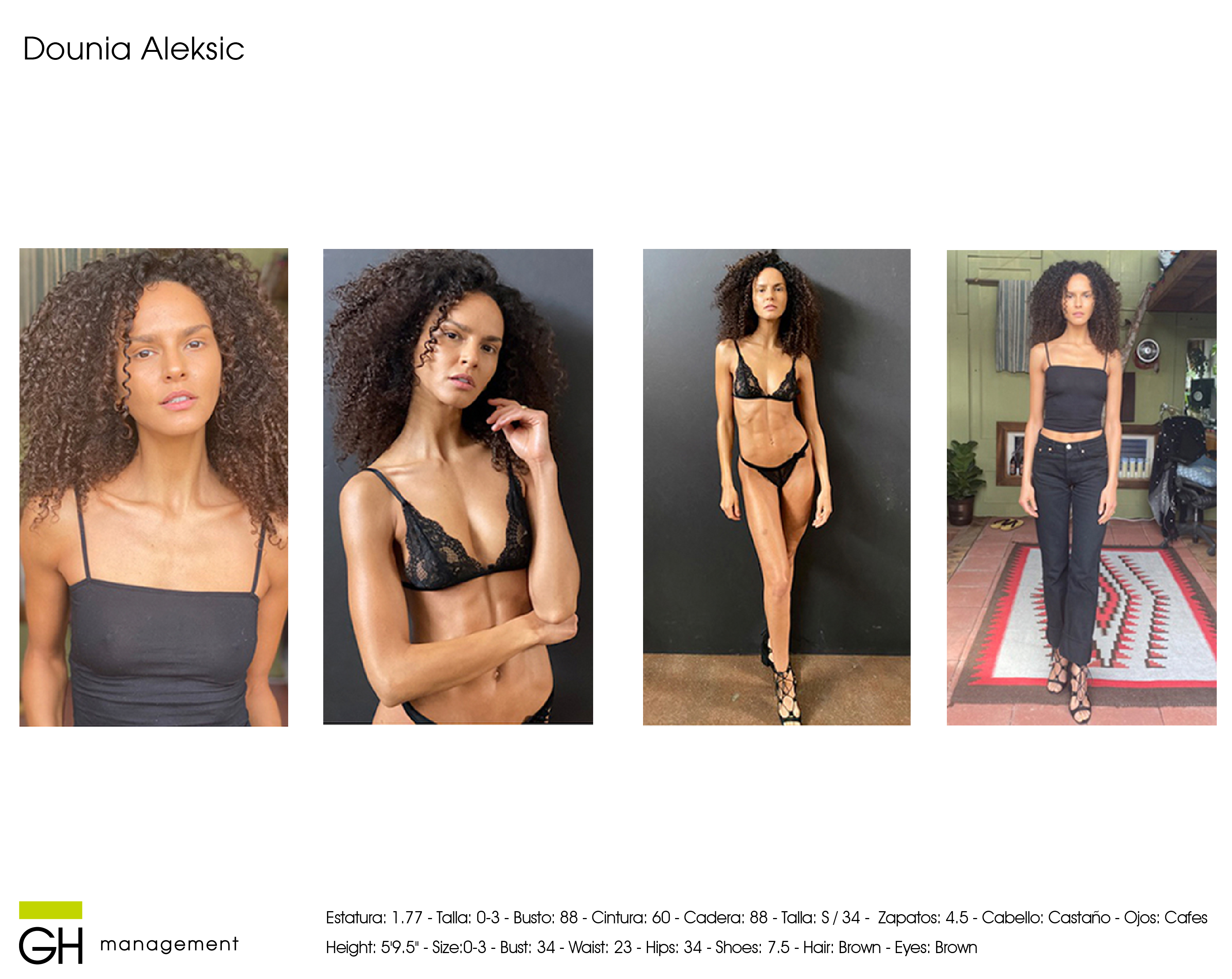 Height: 5'9.5'' - Size:0-3 - Bust: 34 - Waist: 23 - Hips: 34 - Shoes: 7.5 - Hair: Brown - Eyes: Brown