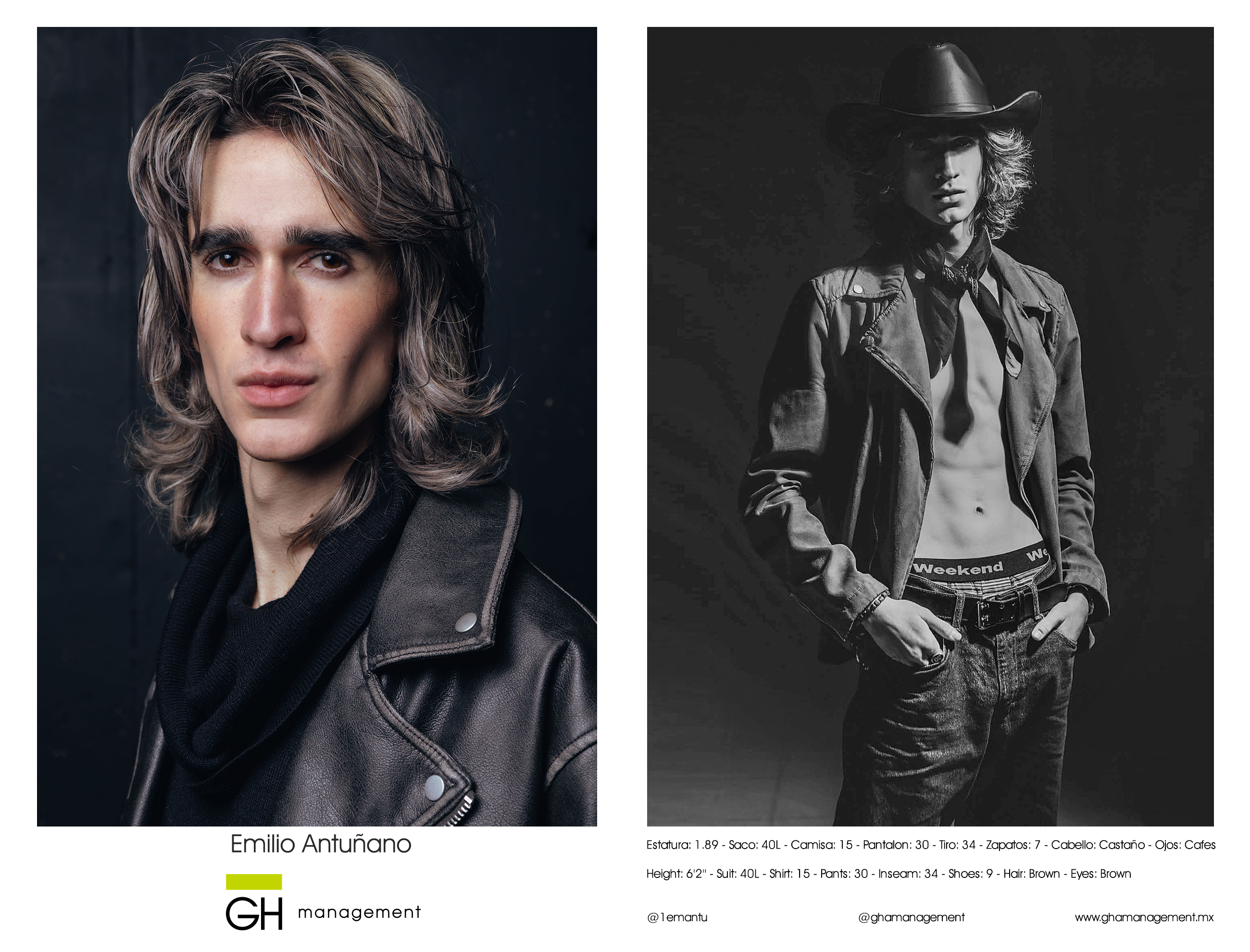 Estatura: 1.89 - Saco: 40L - Camisa: 15 - Pantalon: 30 - Tiro: 34 - Zapatos: 7 - Cabello: Castaño - Ojos: Cafes