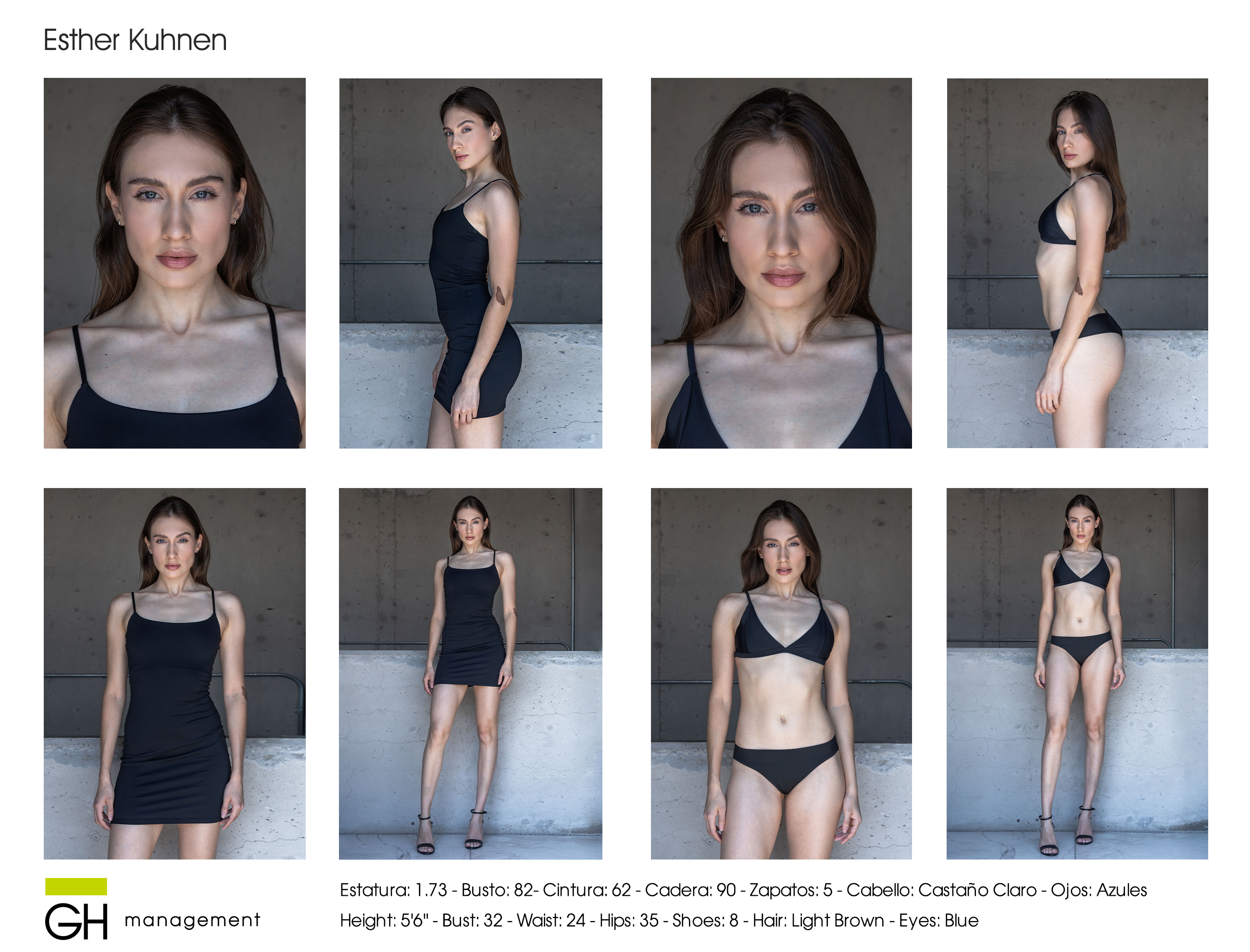 Estatura: 1.73 - Busto: 82- Cintura: 62 - Cadera: 90 - Zapatos: 5 - Cabello: CastaƱo Claro - Ojos: Azules