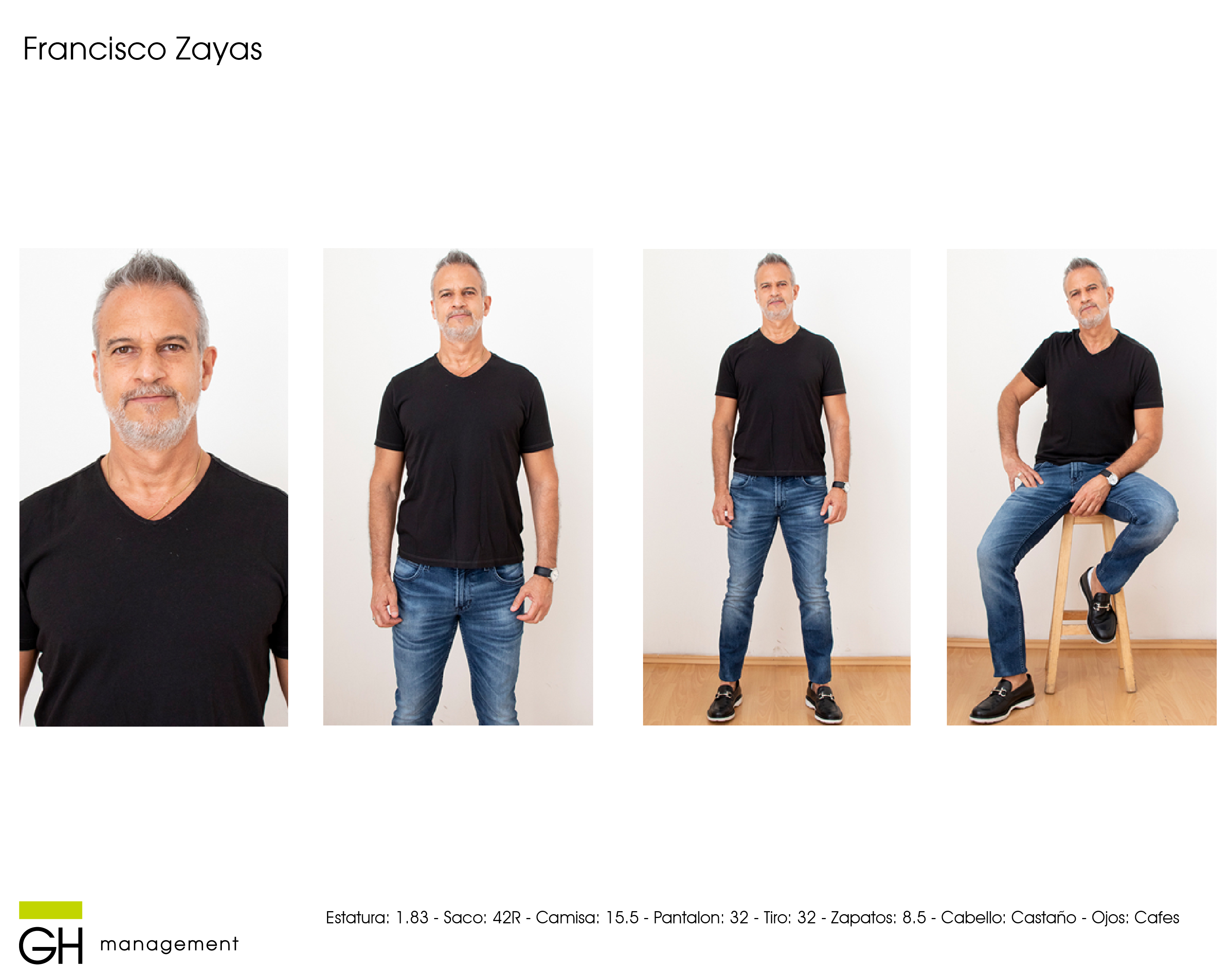 Estatura: 1.83 - Saco: 42R - Camisa: 15.5 - Pantalon: 32 - Tiro: 32 - Zapatos: 8.5 - Cabello: CastaƱo - Ojos: Cafes