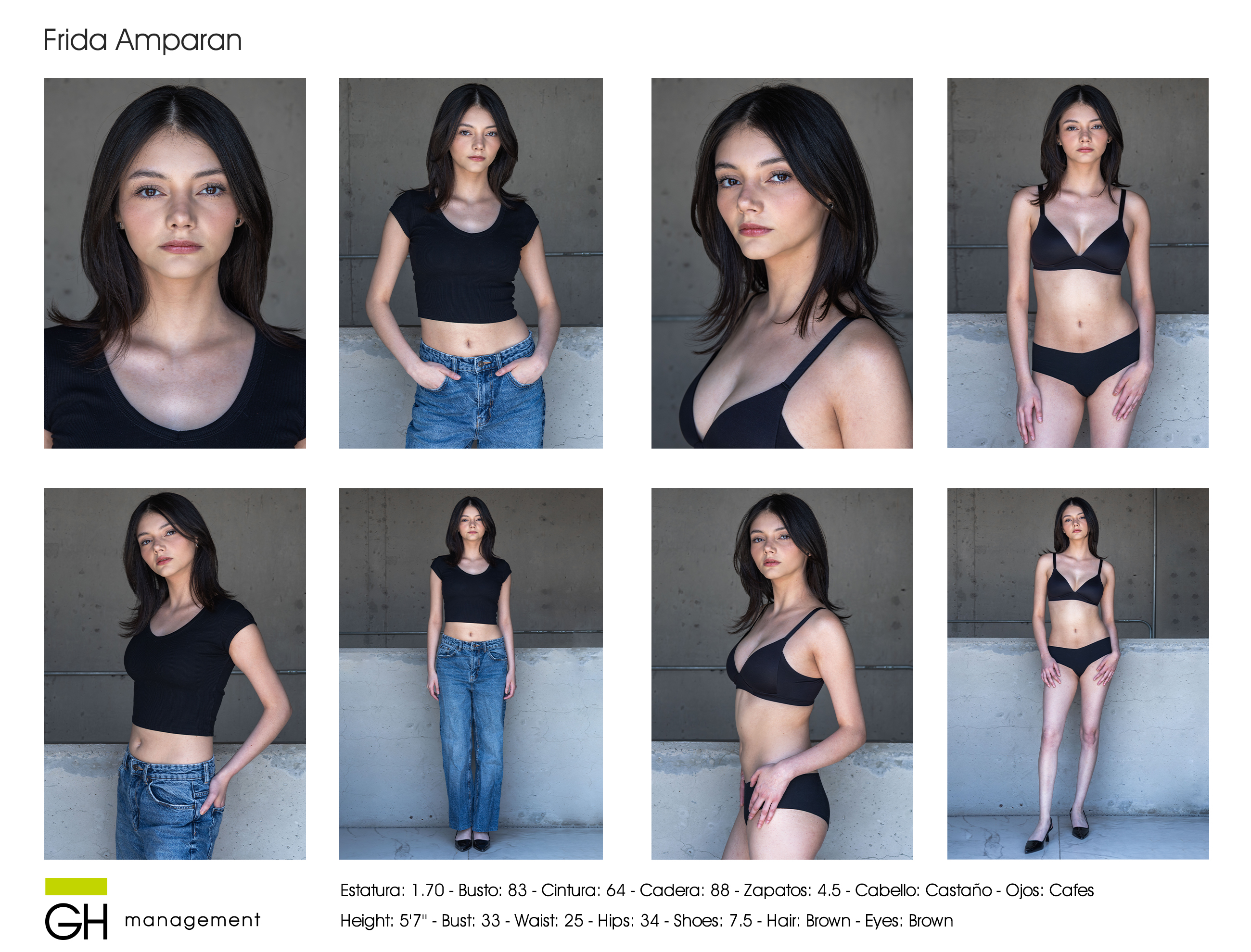 Height: 5'7'' - Bust: 33 - Waist: 25 - Hips: 34 - Shoes: 7.5 - Hair: Brown - Eyes: Brown