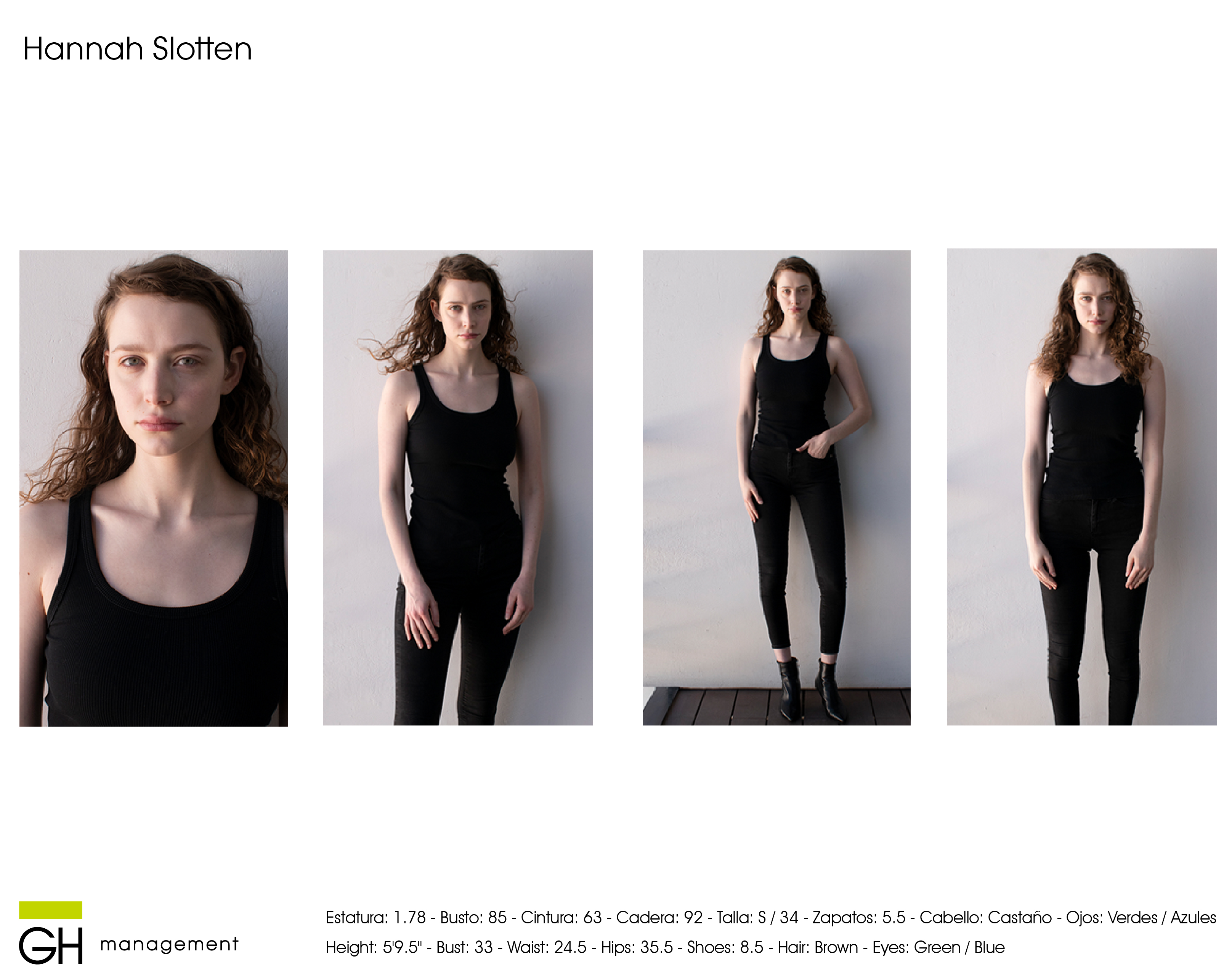 Estatura: 1.78 - Busto: 85 - Cintura: 63 - Cadera: 92 - Zapatos: 5.5 - Cabello: CastaƱo - Ojos: Verdes / Azules