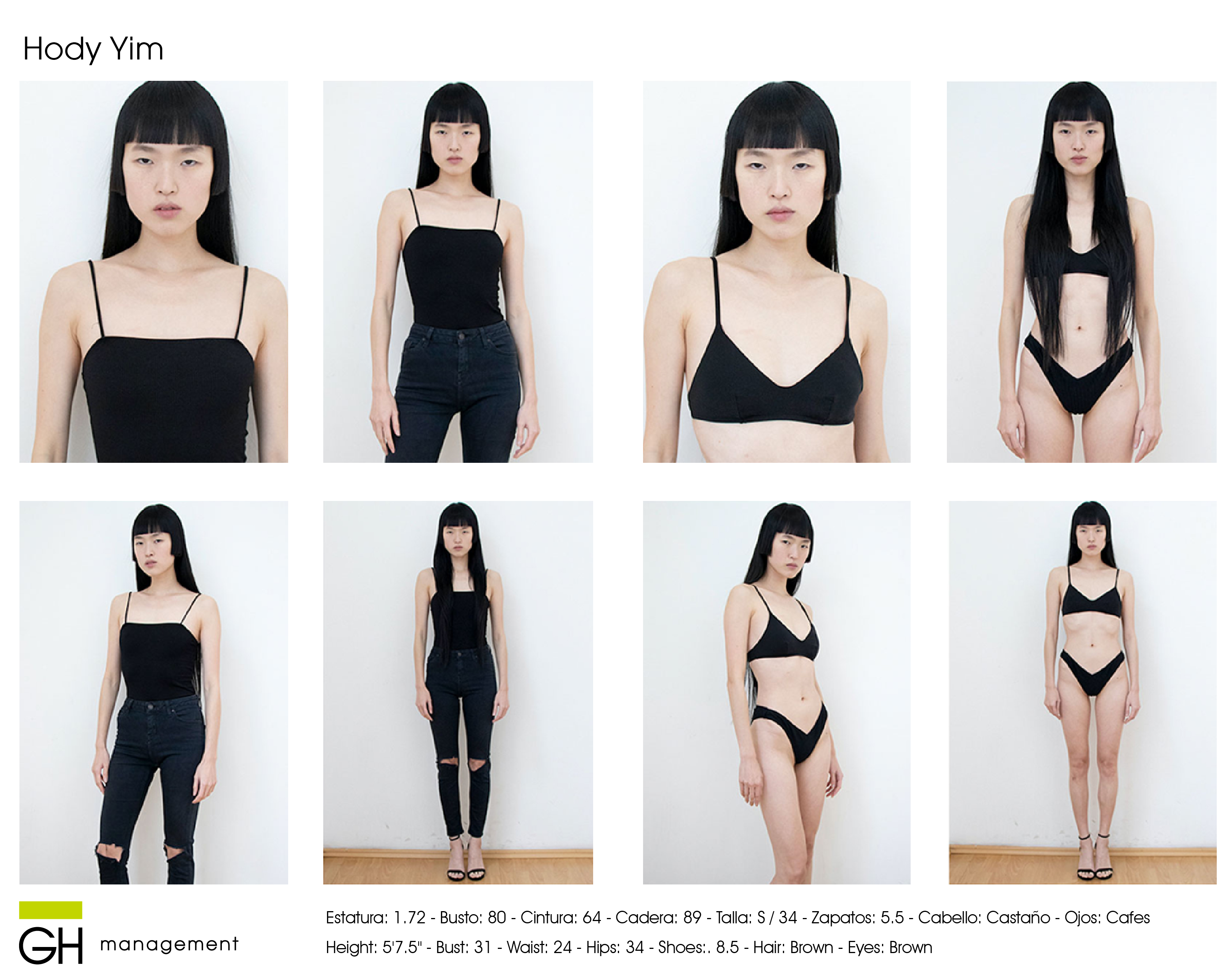 Height: 5'7.5'' - Bust: 31 - Waist: 24 - Hips: 34 - Shoes:. 8.5 - Hair: Brown - Eyes: Brown