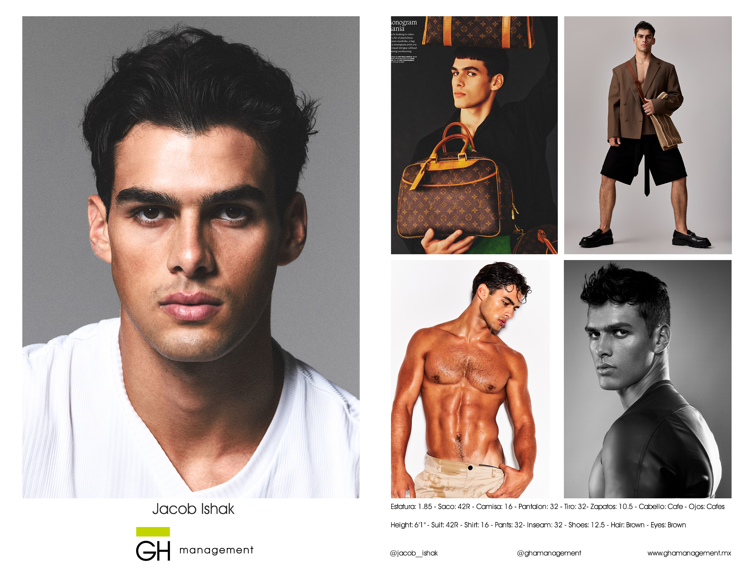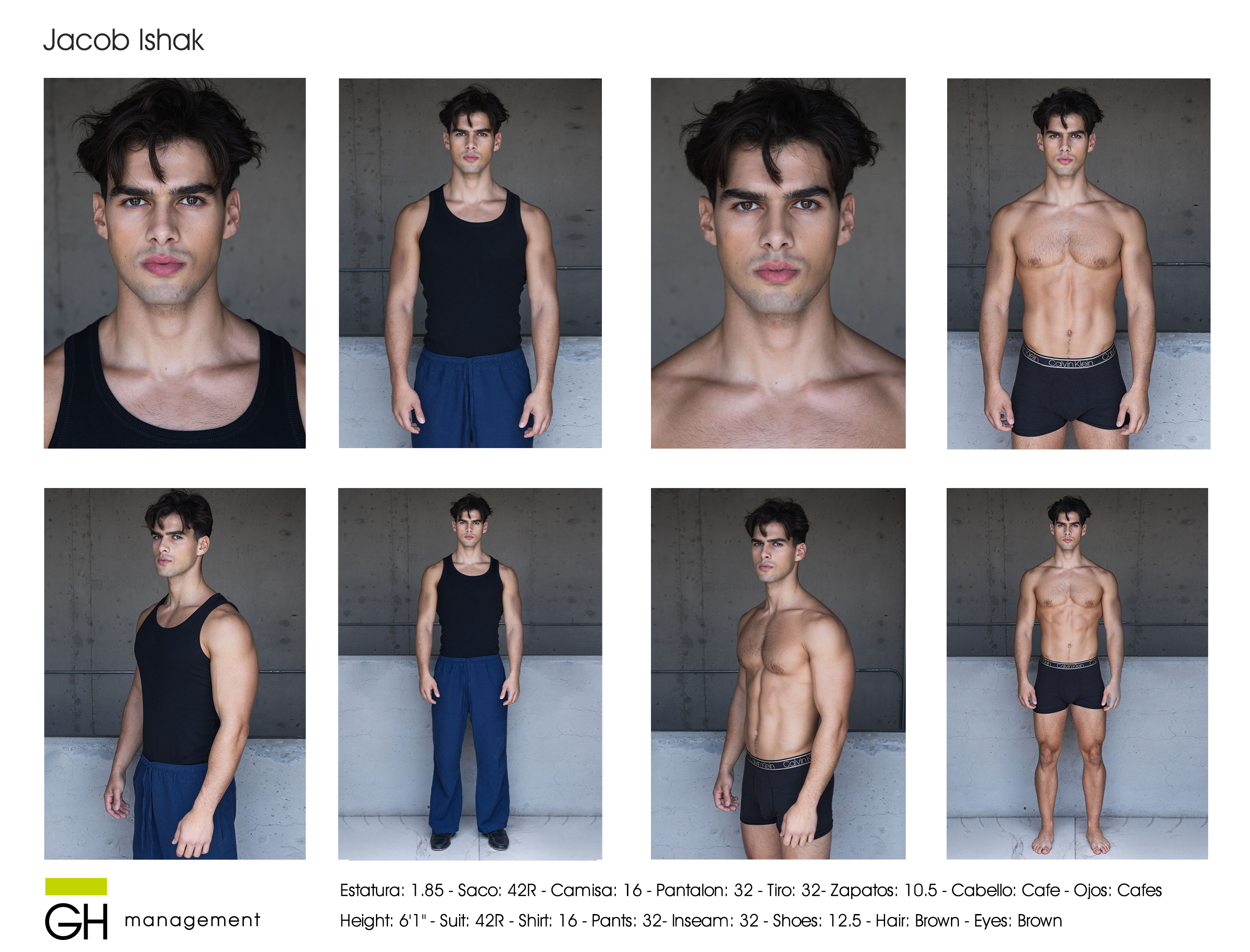 Estatura: 1.85 - Saco: 42R - Camisa: 16 - Pantalon: 32 - Tiro: 32- Zapatos: 10.5 - Cabello: Cafe - Ojos: Cafes