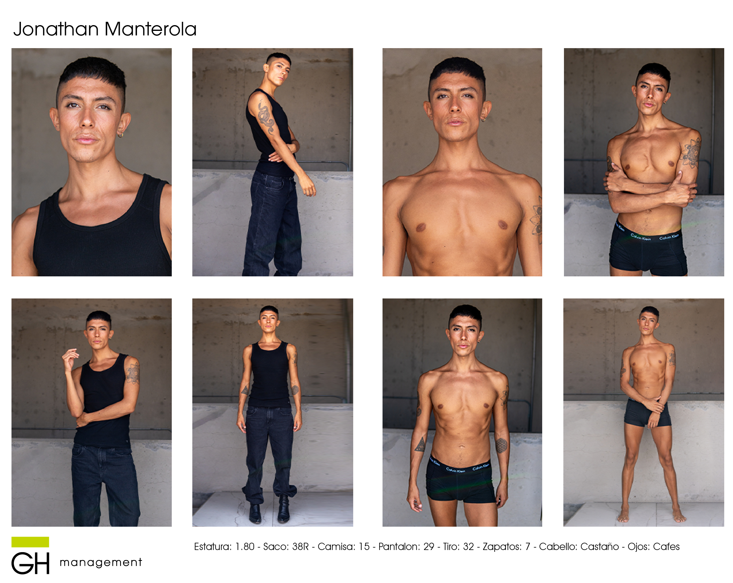 Estatura: 1.80 - Saco: 38R - Camisa: 15 - Pantalon: 29 - Tiro: 32 - Zapatos: 7 - Cabello: CastaƱo - Ojos: Cafes