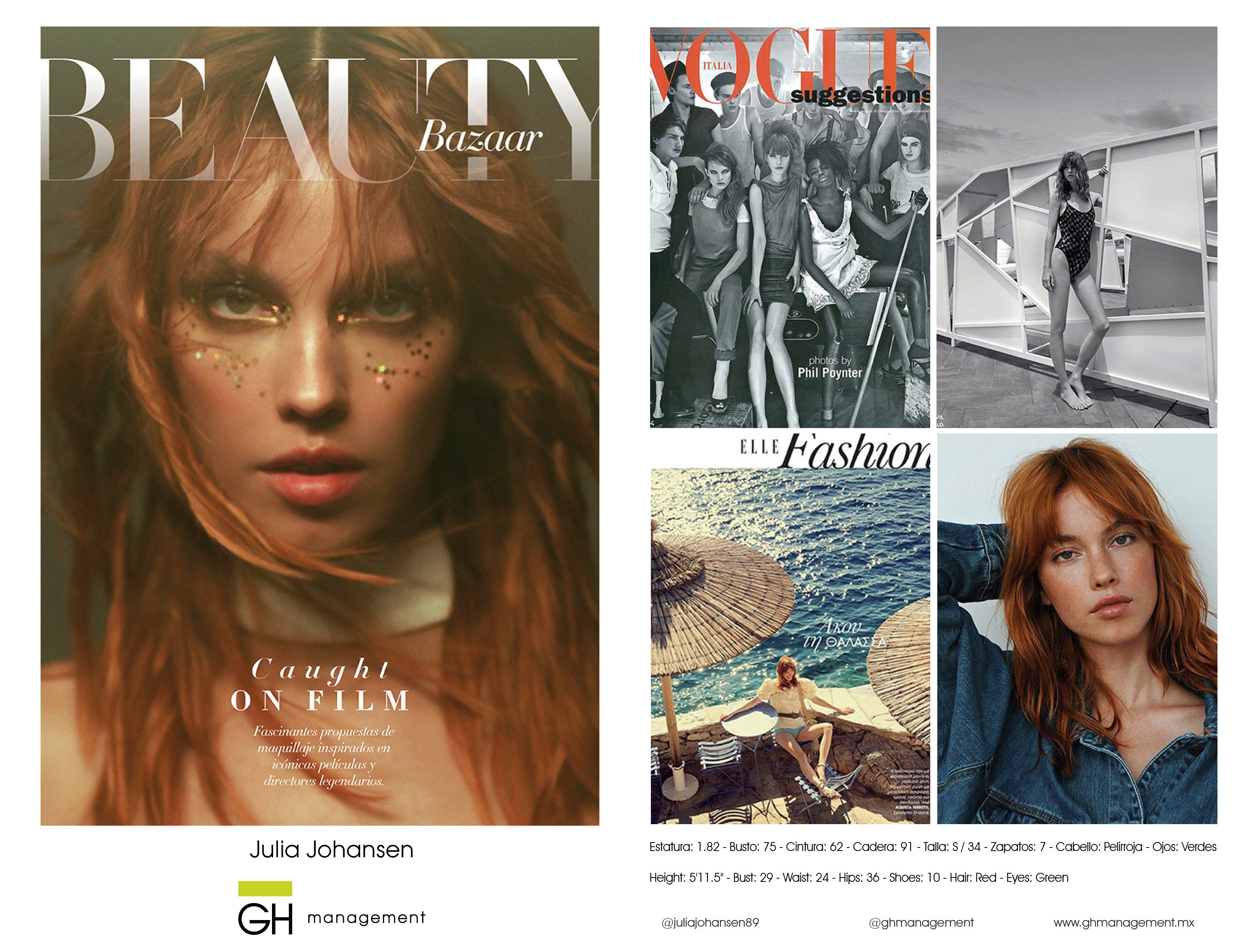 Estatura: 1.82 - Busto: 75 - Cintura: 62 - Cadera: 91 - Zapatos: 7 - Cabello: Pelirroja - Ojos: Verdes