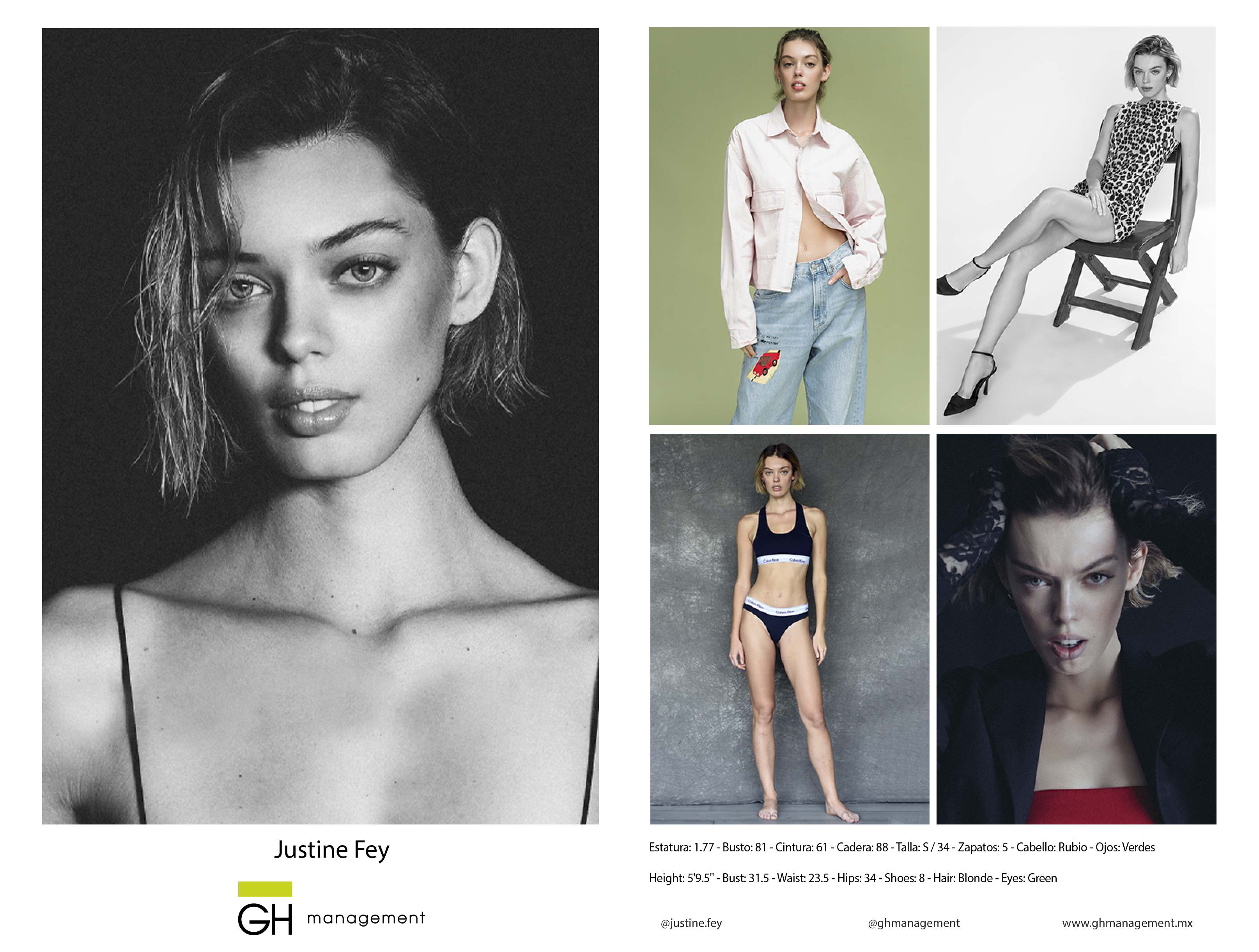 Estatura: 1.77 - Busto: 81 - Cintura: 61 - Cadera: 88 - Zapatos: 5 - Cabello: Rubio - Ojos: Verdes