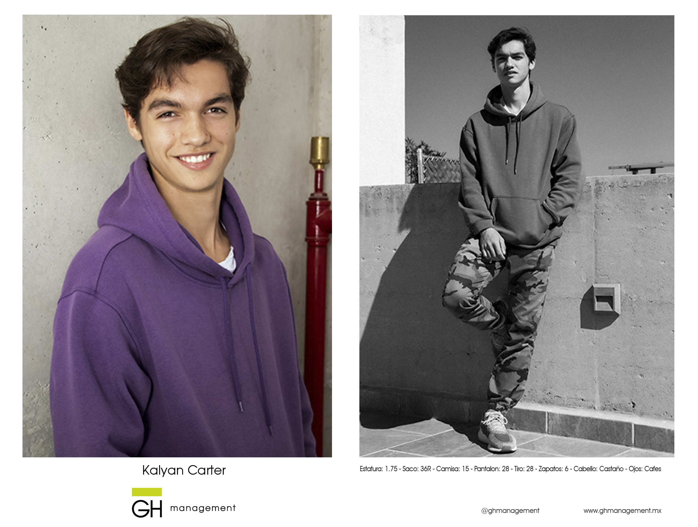 Estatura: 1.75 - Saco: 36R - Camisa: 15 - Pantalon: 28 - Tiro: 28 - Zapatos: 6 - Cabello: CastaƱo - Ojos: Cafes