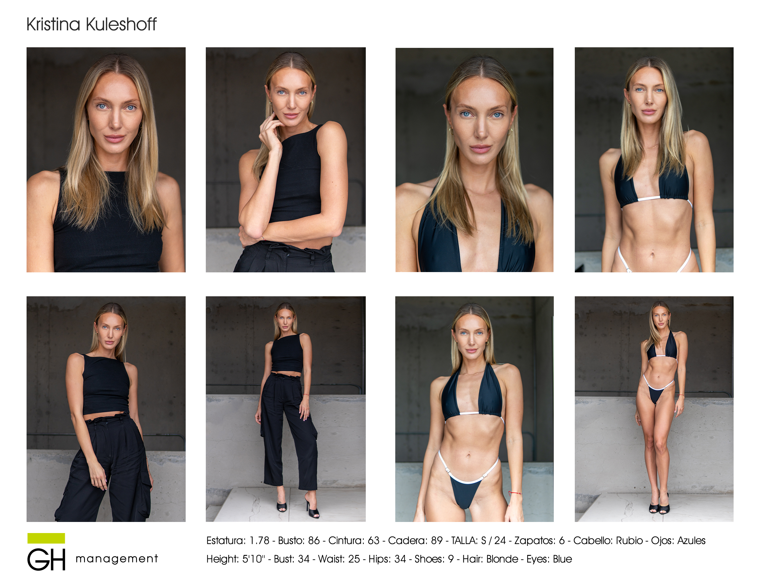 Estatura: 1.78 - Busto: 86 - Cintura: 63 - Cadera: 89 - Zapatos: 6 - Cabello: Rubio - Ojos: Azules