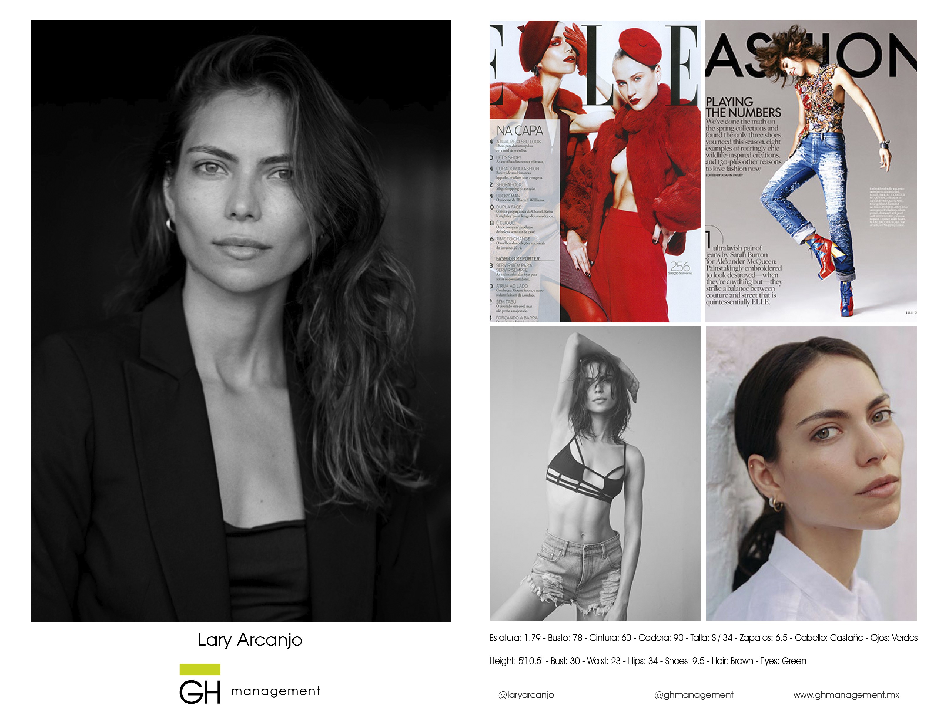 Estatura: 1.79 - Busto: 78 - Cintura: 60 - Cadera: 90 - Zapatos: 6.5 - Cabello: CastaƱo - Ojos: Verdes