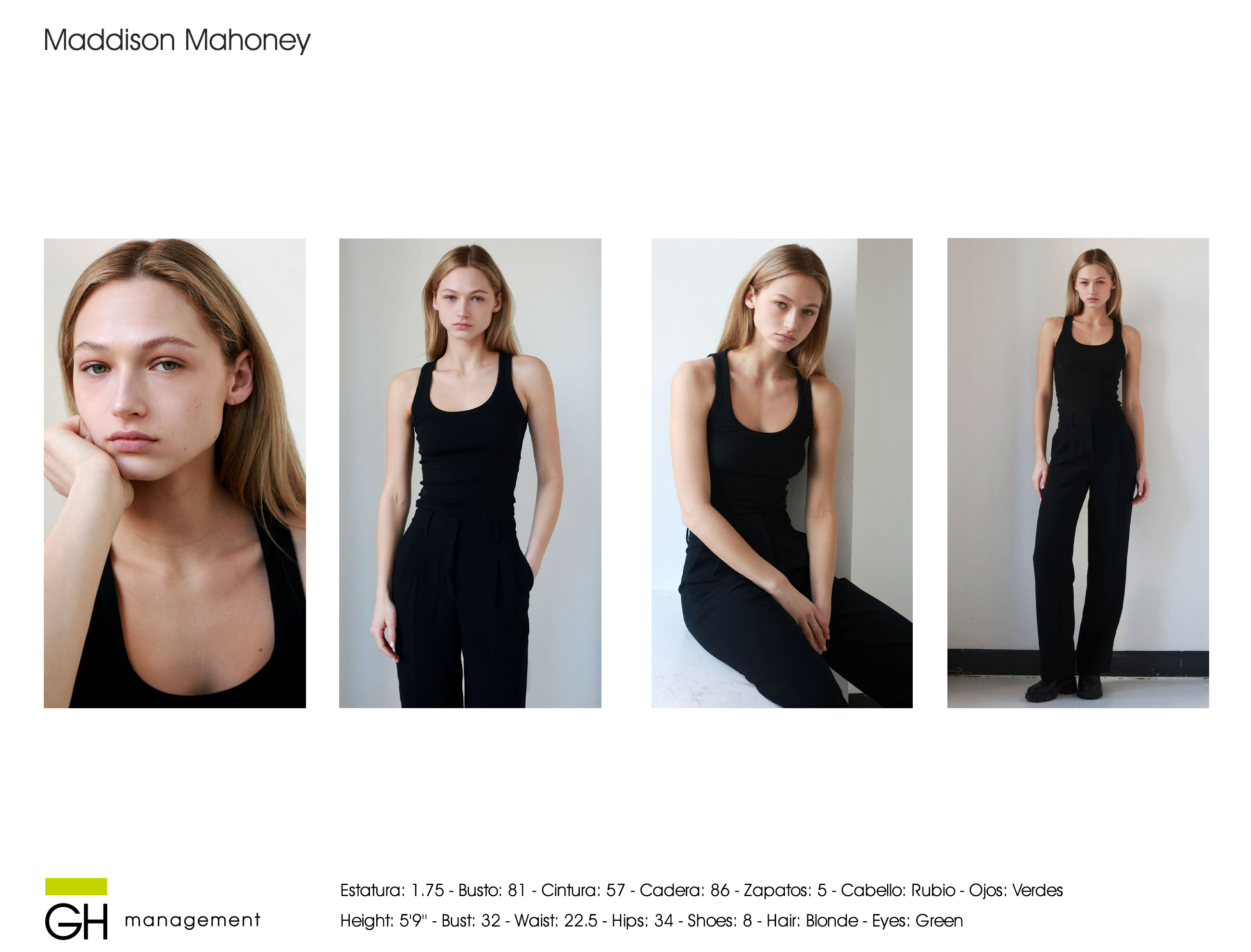 Estatura: 1.75 - Busto: 81 - Cintura: 57 - Cadera: 86 - Zapatos: 5 - Cabello: Rubio - Ojos: Verdes