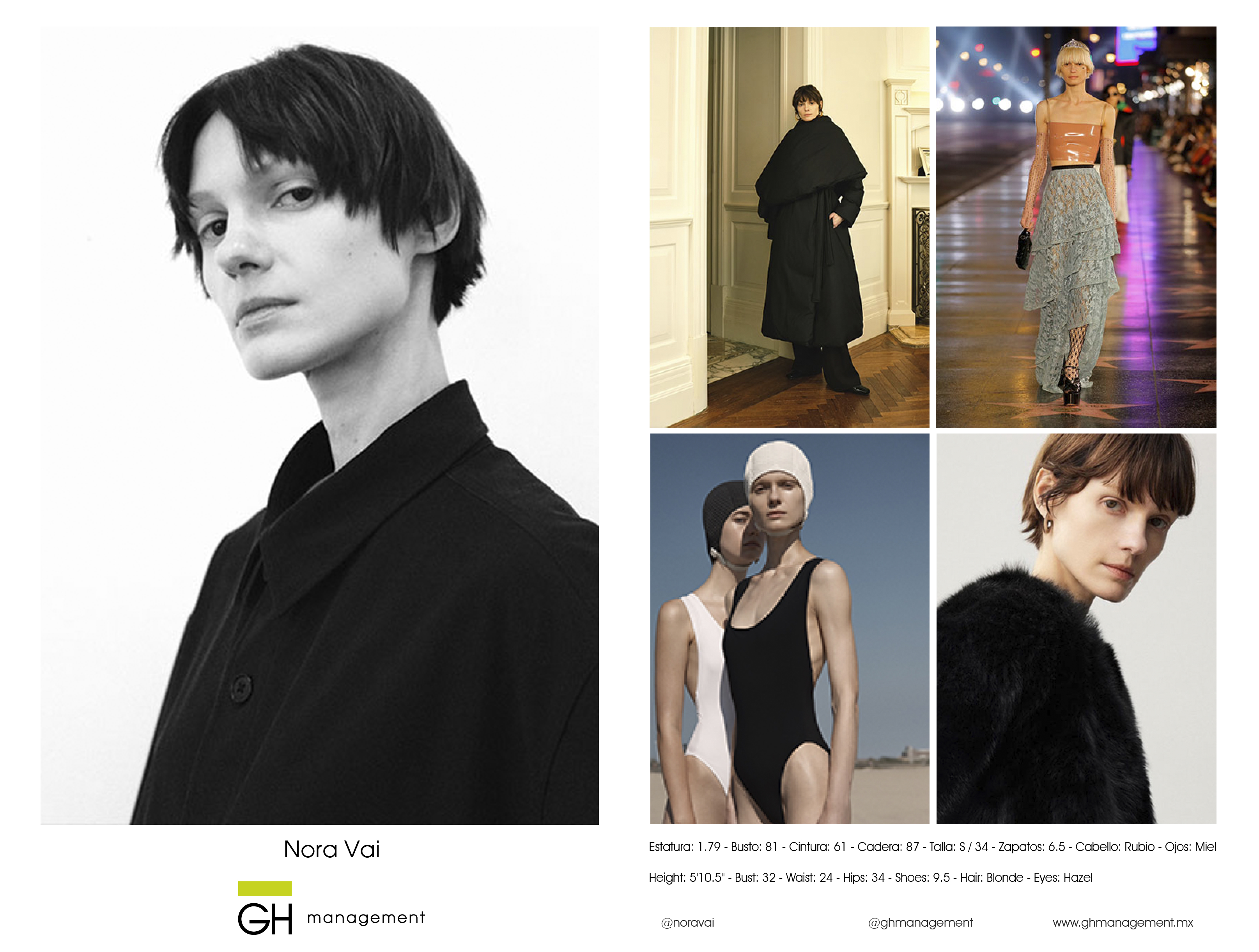 Estatura: 1.79 - Busto: 81 - Cintura: 61 - Cadera: 87 - Zapatos: 6.5 - Cabello: Rubio - Ojos: Miel
