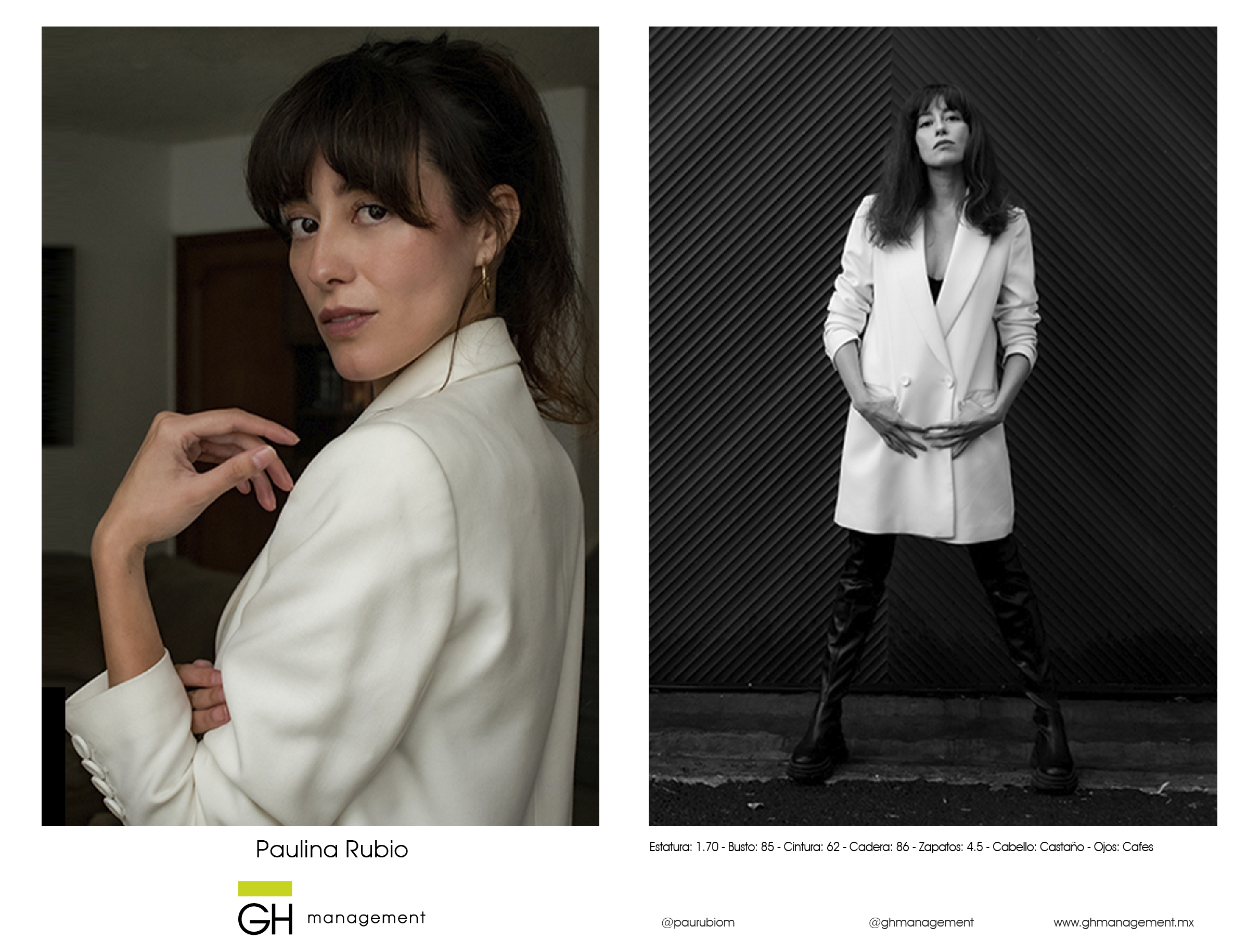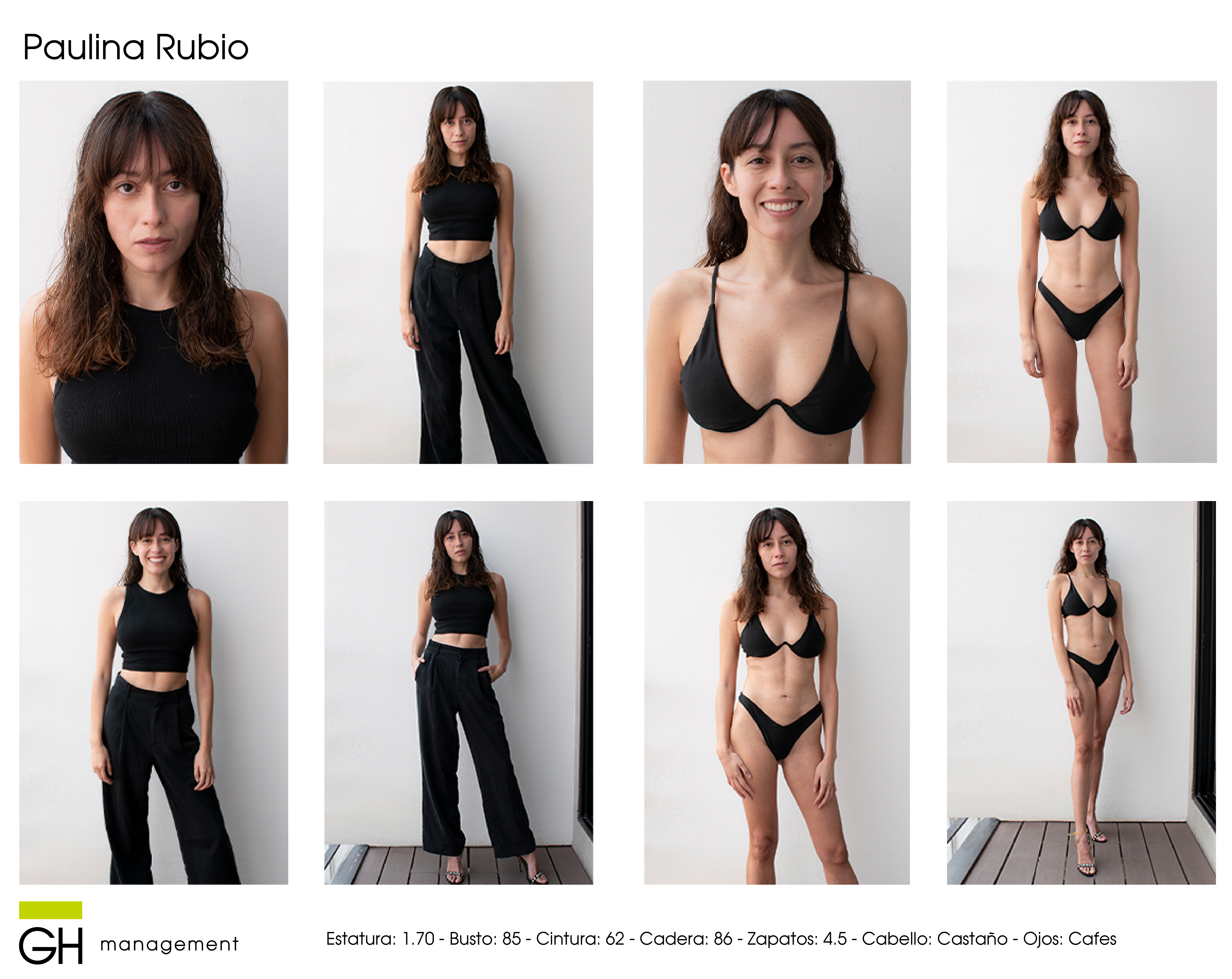 Estatura: 1.70 - Busto: 85 - Cintura: 62 - Cadera: 86 - Zapatos: 4.5 - Cabello: CastaƱo - Ojos: Cafes