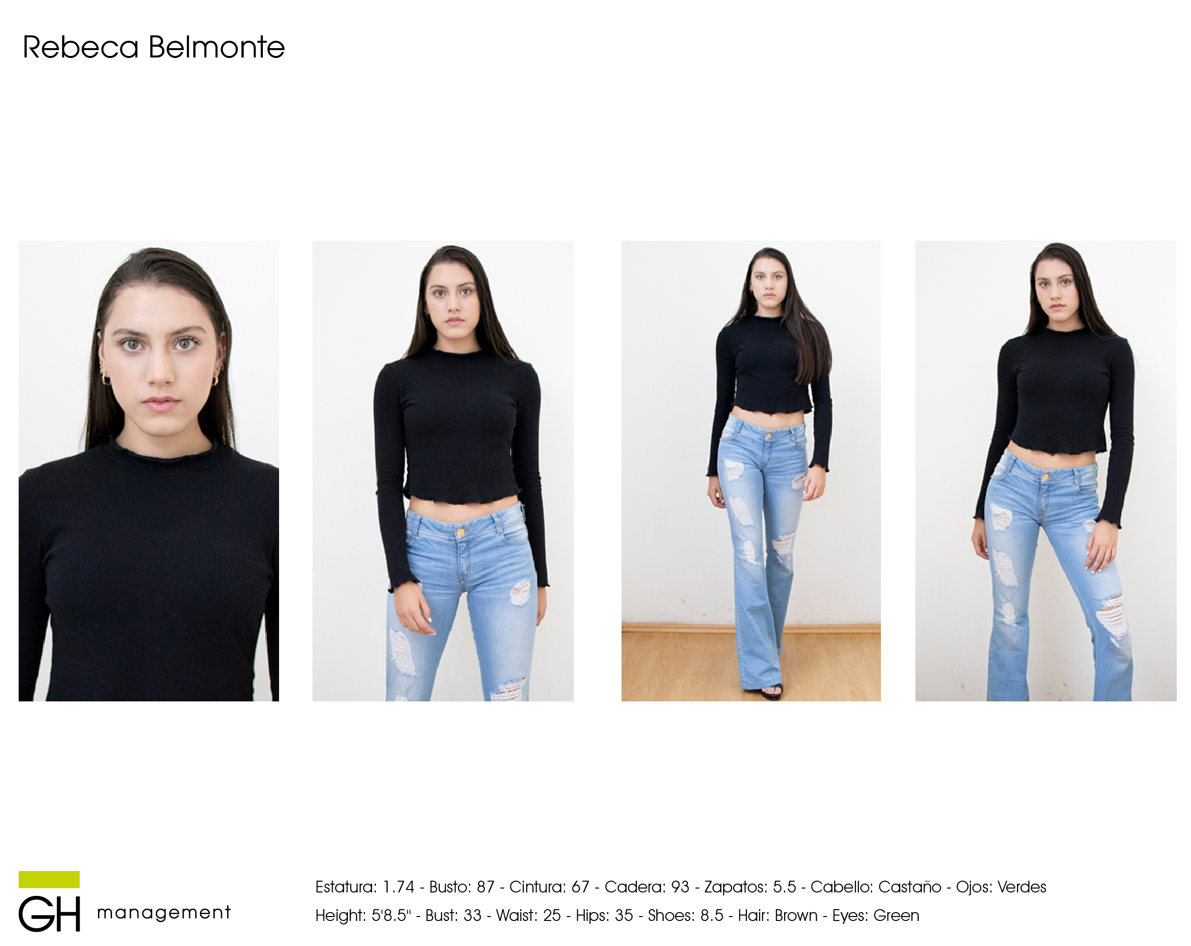 Estatura: 1.74 - Busto: 87 - Cintura: 67 - Cadera: 93 - Zapatos: 5.5 - Cabello: CastaƱo - Ojos: Verdes