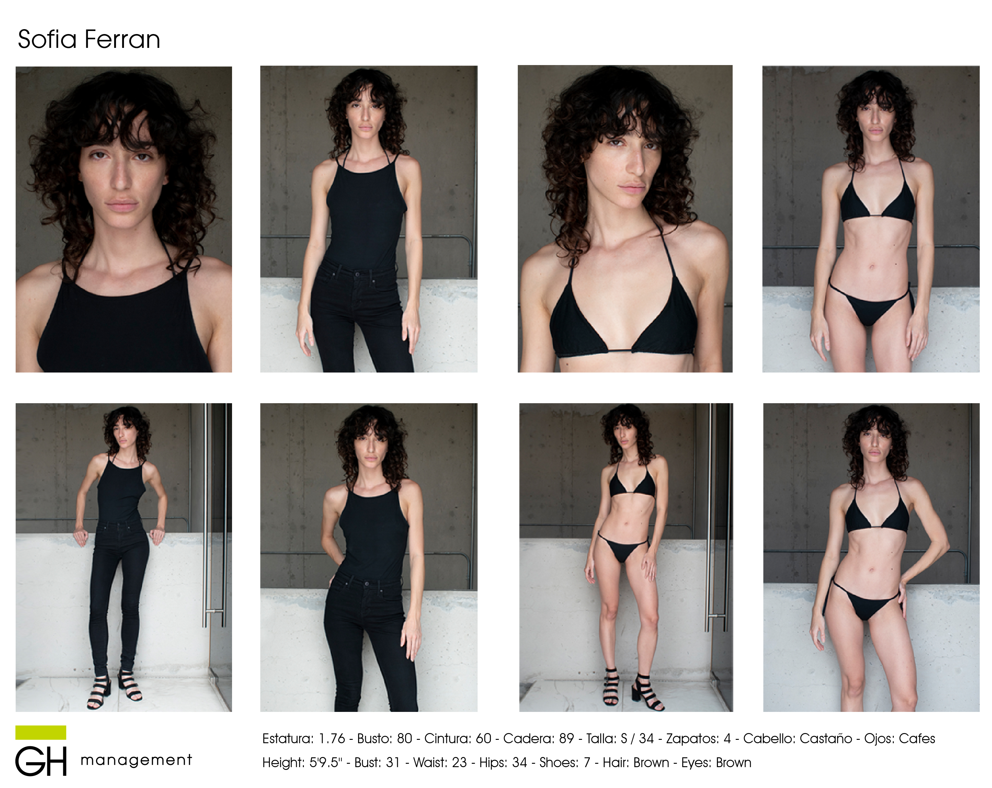 Estatura: 1.76 - Busto: 80 - Cintura: 60 - Cadera: 89 - Zapatos: 4 - Cabello: CastaƱo - Ojos: Cafes