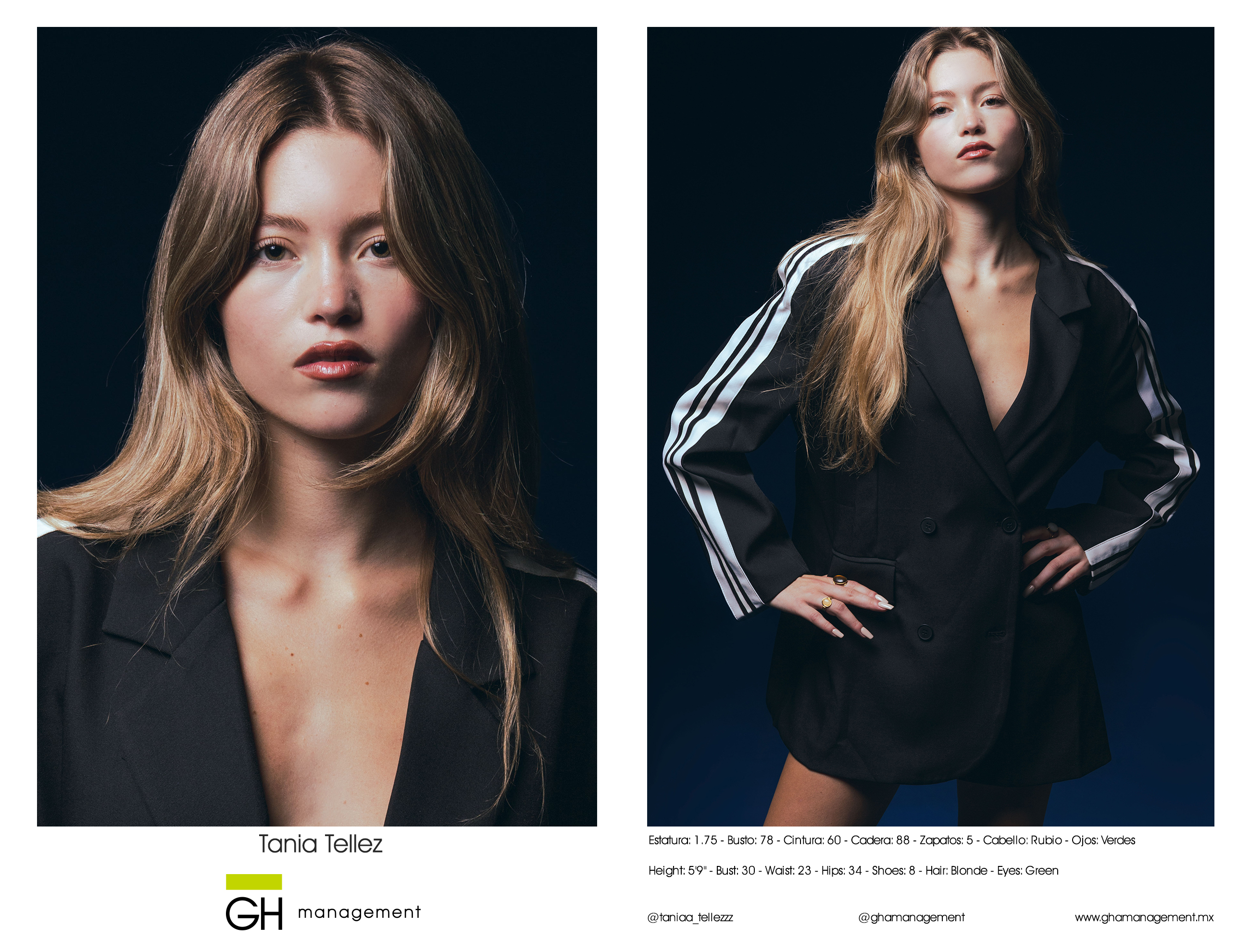 Estatura: 1.75 - Busto: 78 - Cintura: 60 - Cadera: 88 - Zapatos: 5 - Cabello: Rubio - Ojos: Verdes