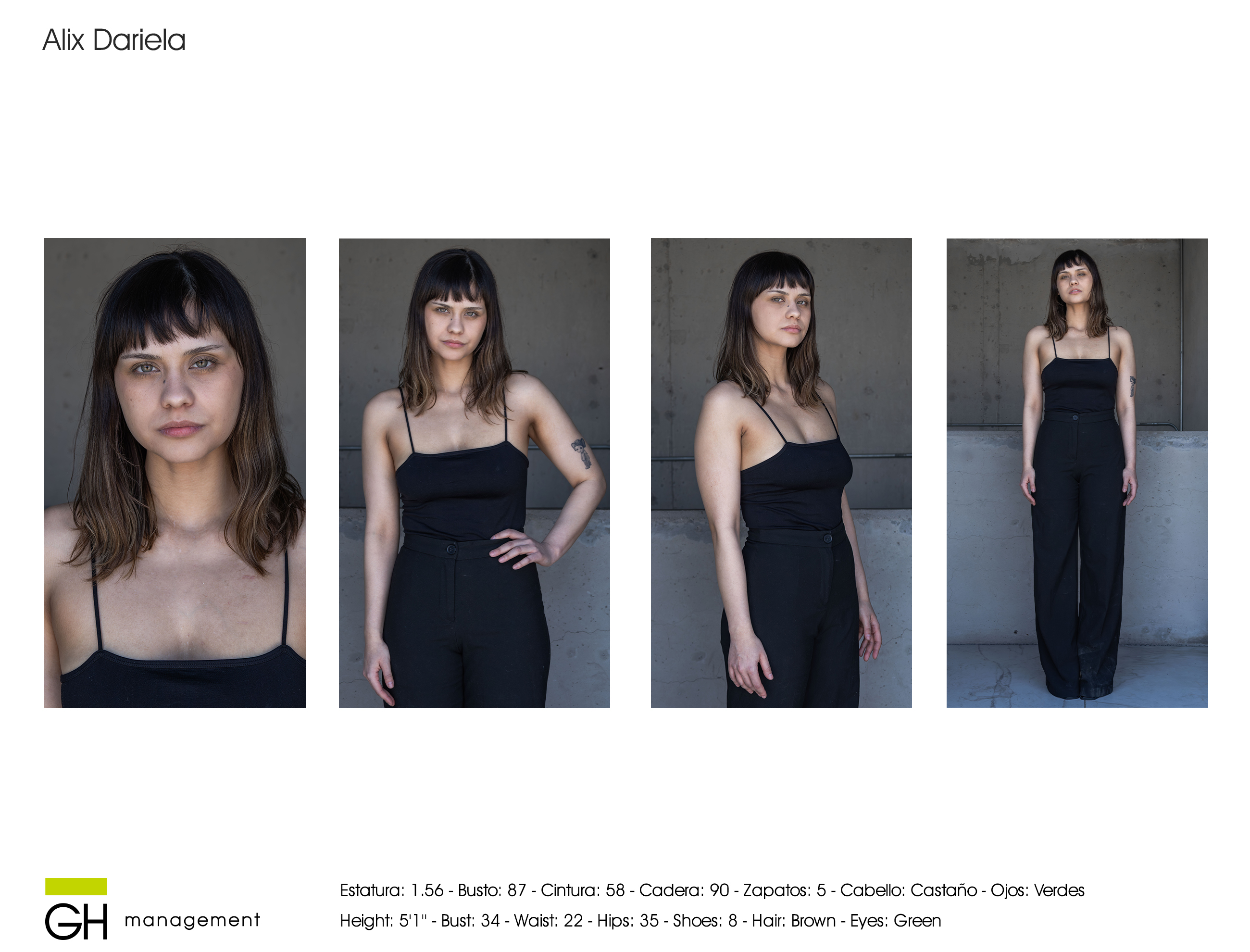 Estatura: 1.56 - Busto: 87 - Cintura: 58 - Cadera: 90 - Zapatos: 5 - Cabello: CastaƱo - Ojos: Verdes