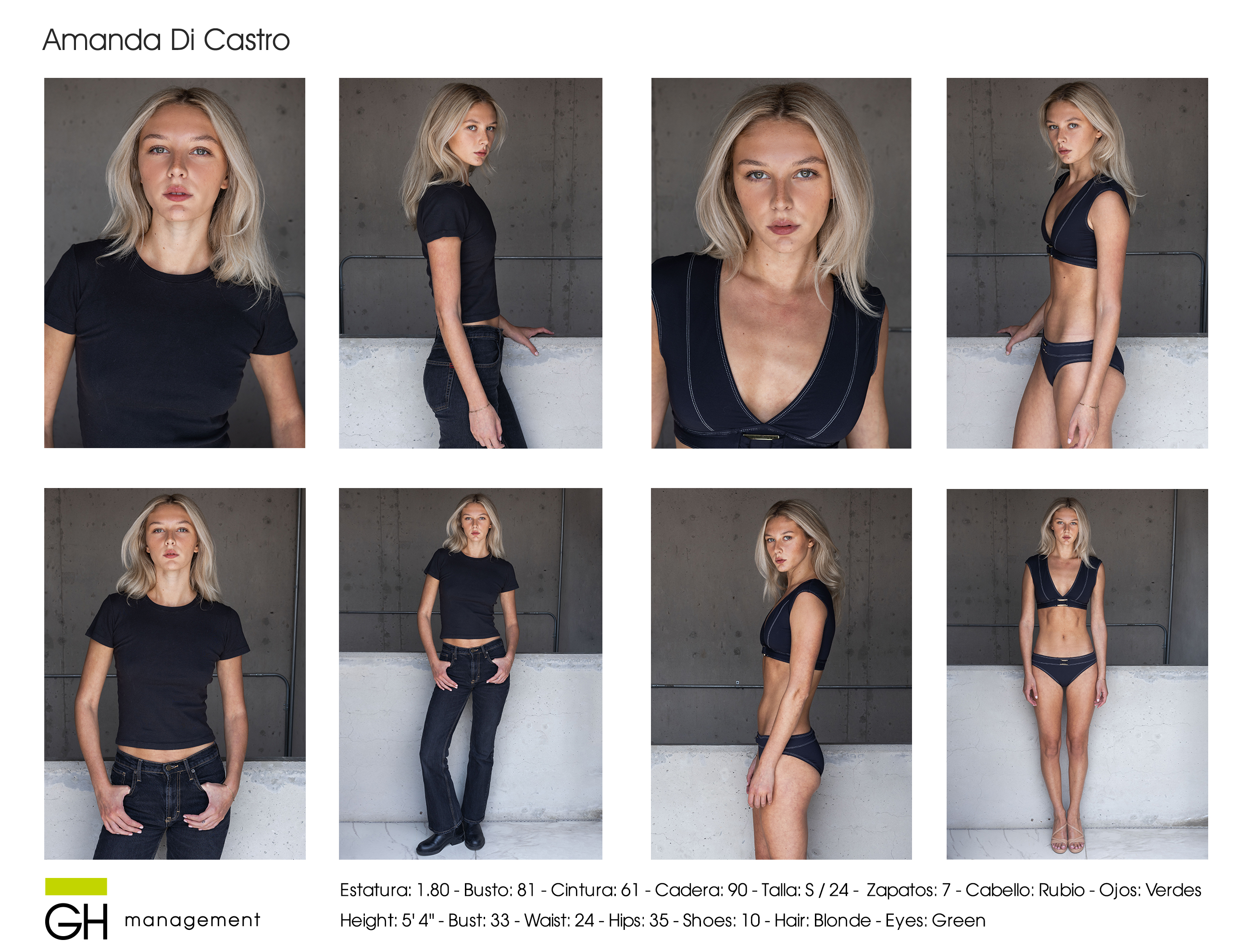 Height: 5’11 - Bust: 33 - Waist: 24 - Hips: 35 - Shoes: 10 - Cabello: Blonde - Ojos: Green