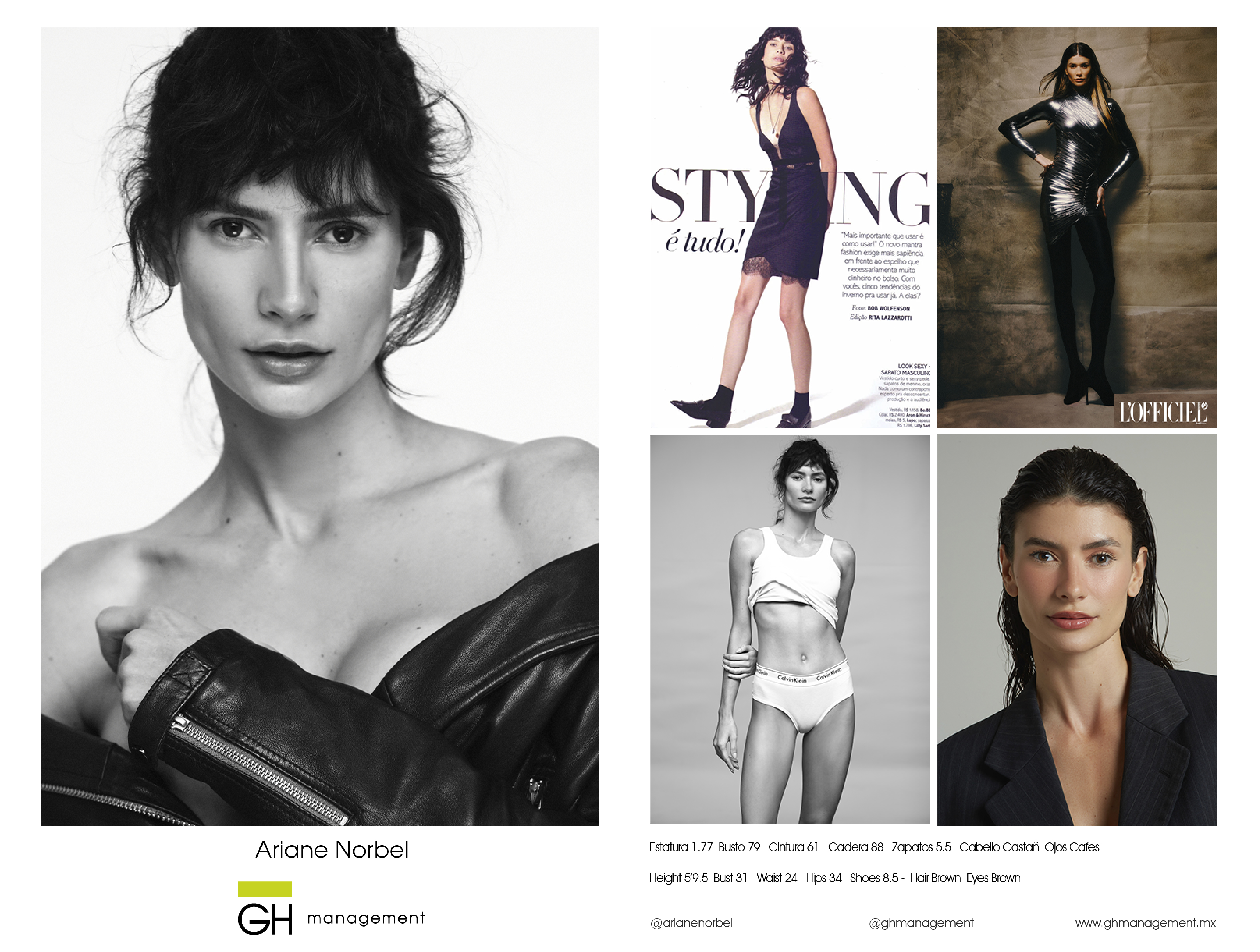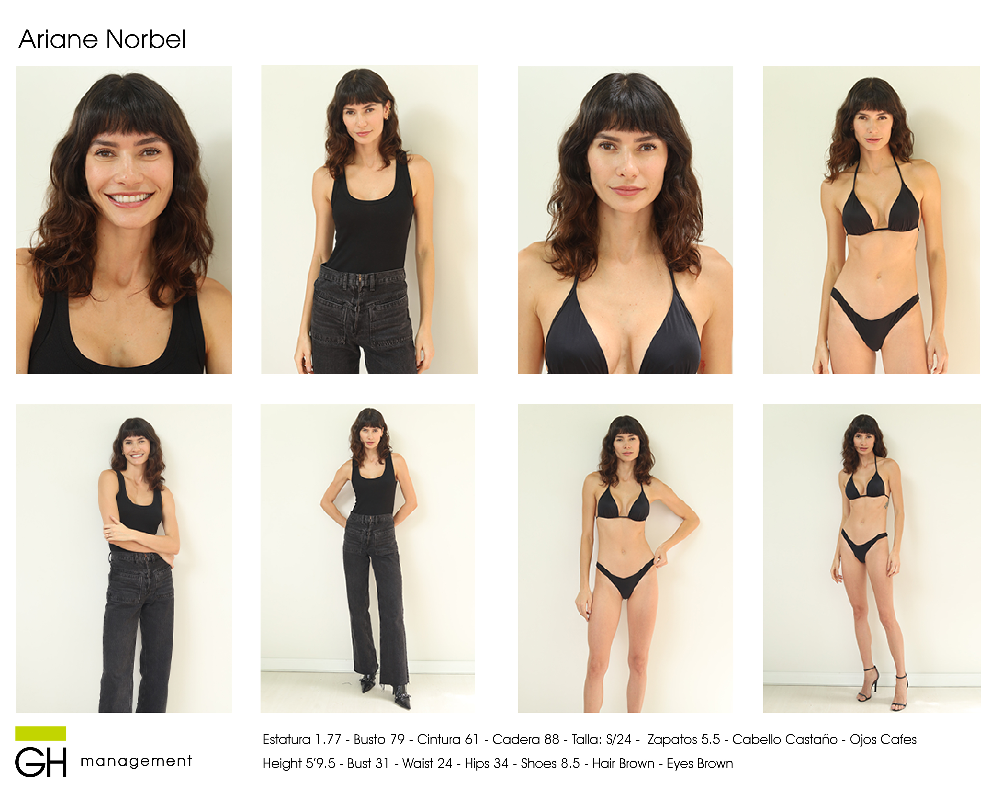 Estatura 1.77 - Busto 79 - Cintura 61 - Cadera 88 - Zapatos 5.5 - Cabello Castaño - Ojos Cafes