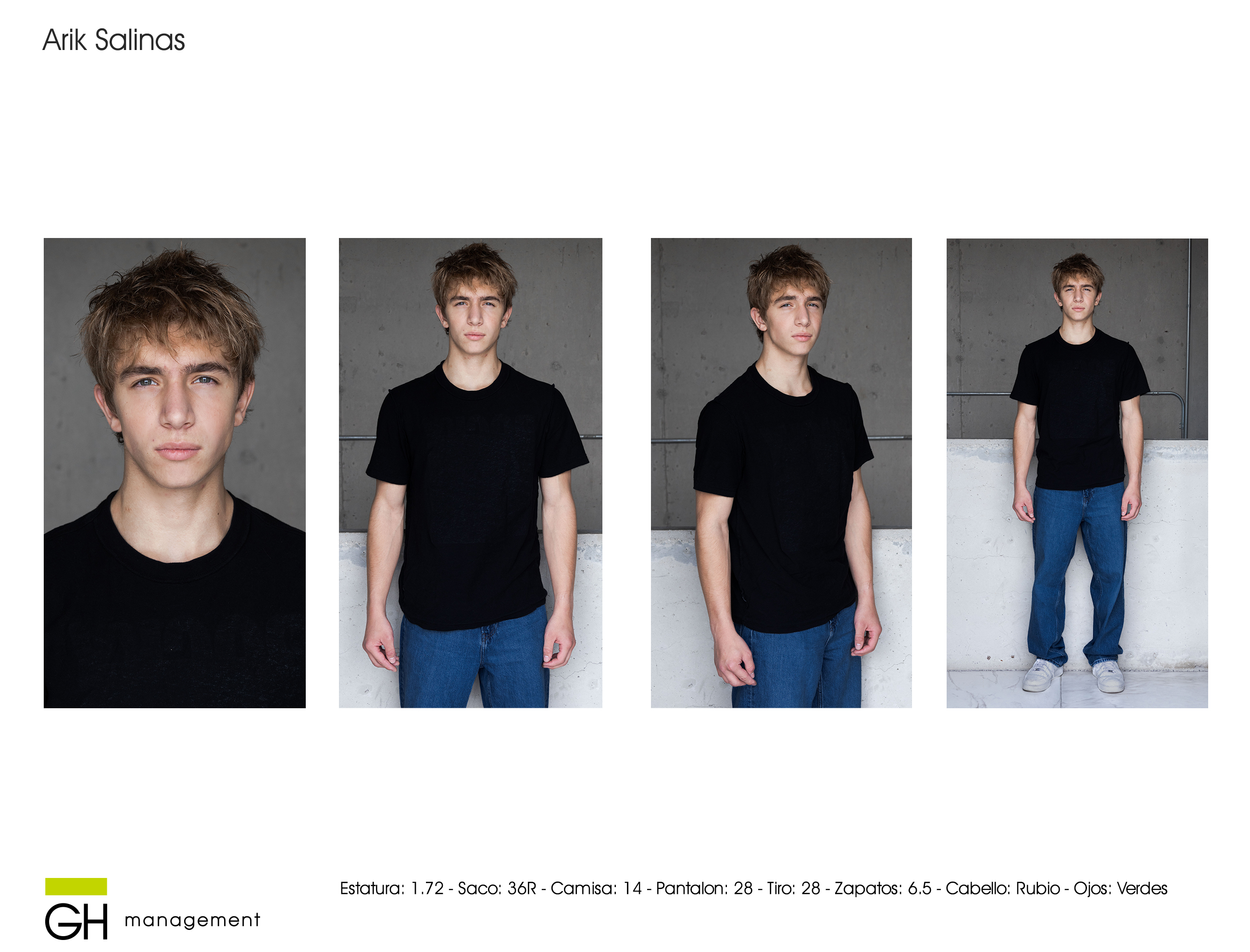 Estatura: 1.72 - Saco: 36R - Camisa: 14 - Pantalon: 28 - Tiro: 28 - Zapatos: 6.5 - Cabello: Rubio - Ojos: Verdes
