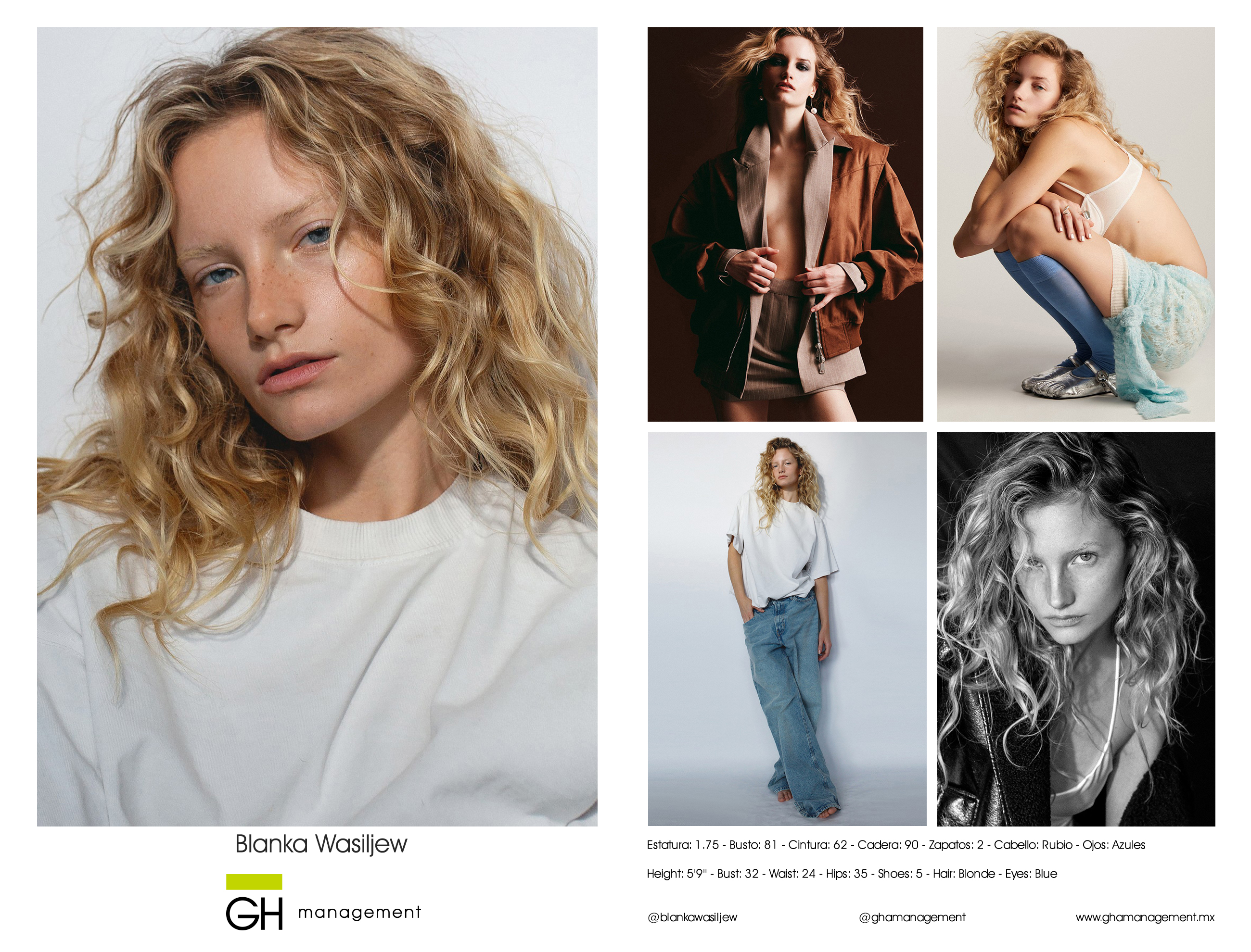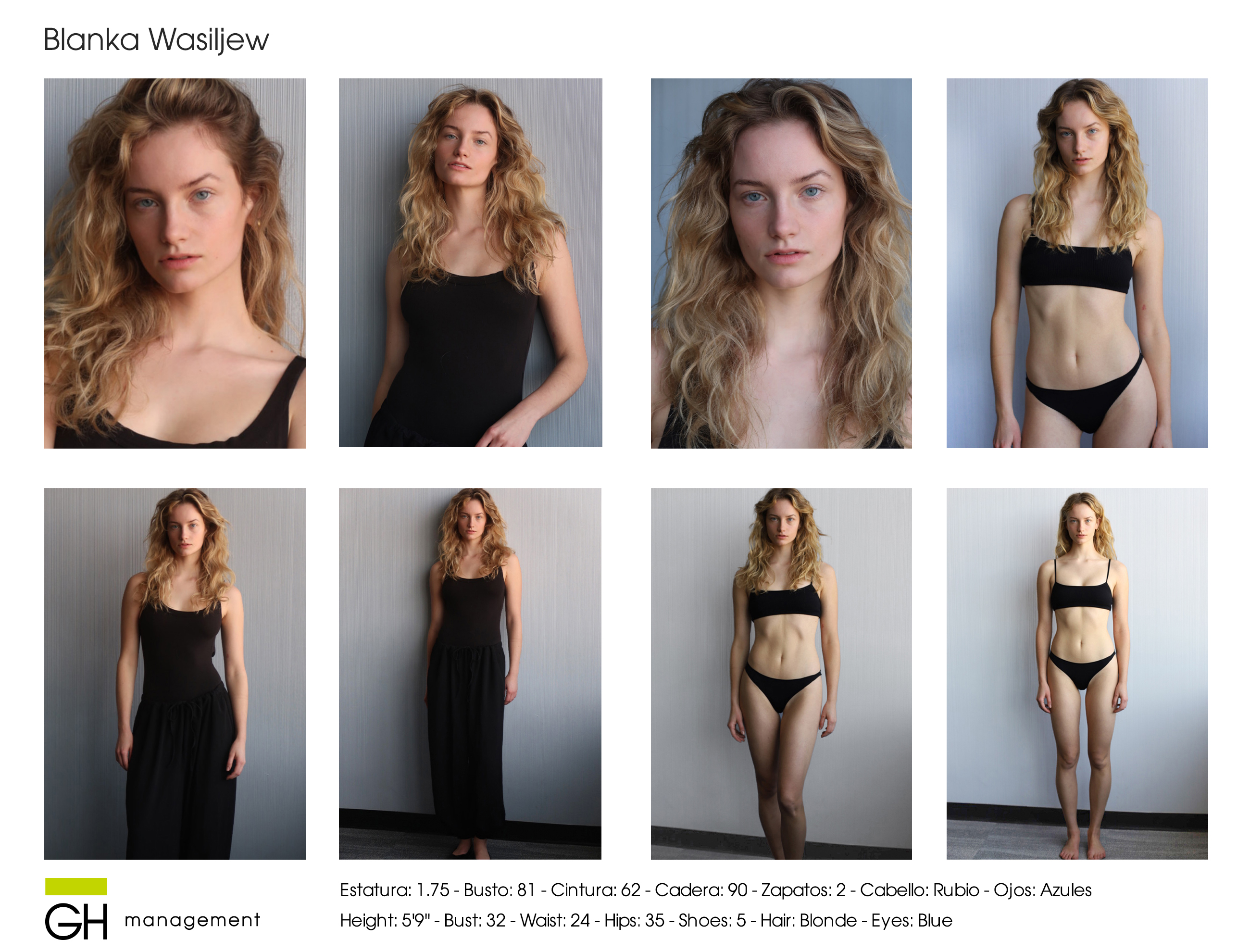Estatura: 1.75 - Busto: 81 - Cintura: 62 - Cadera: 90 - Zapatos: 2 - Cabello: Rubio - Ojos: Azules
