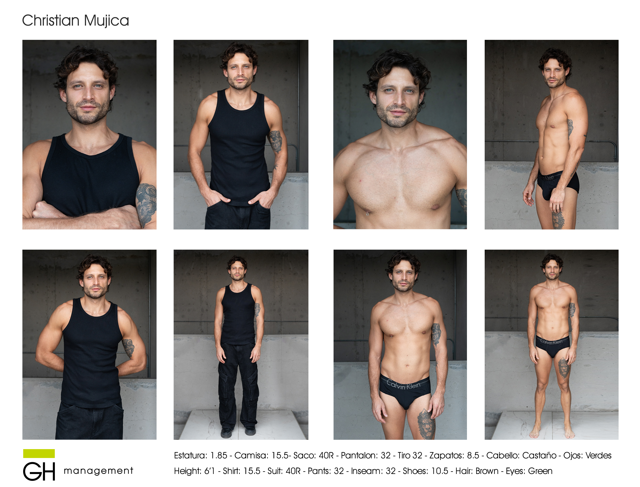 Estatura: 1.85 - Camisa: 15.5- Saco: 40R - Pantalon: 32 - Tiro 32 - Zapatos: 8.5 - Cabello: Castaño - Ojos: Verdes