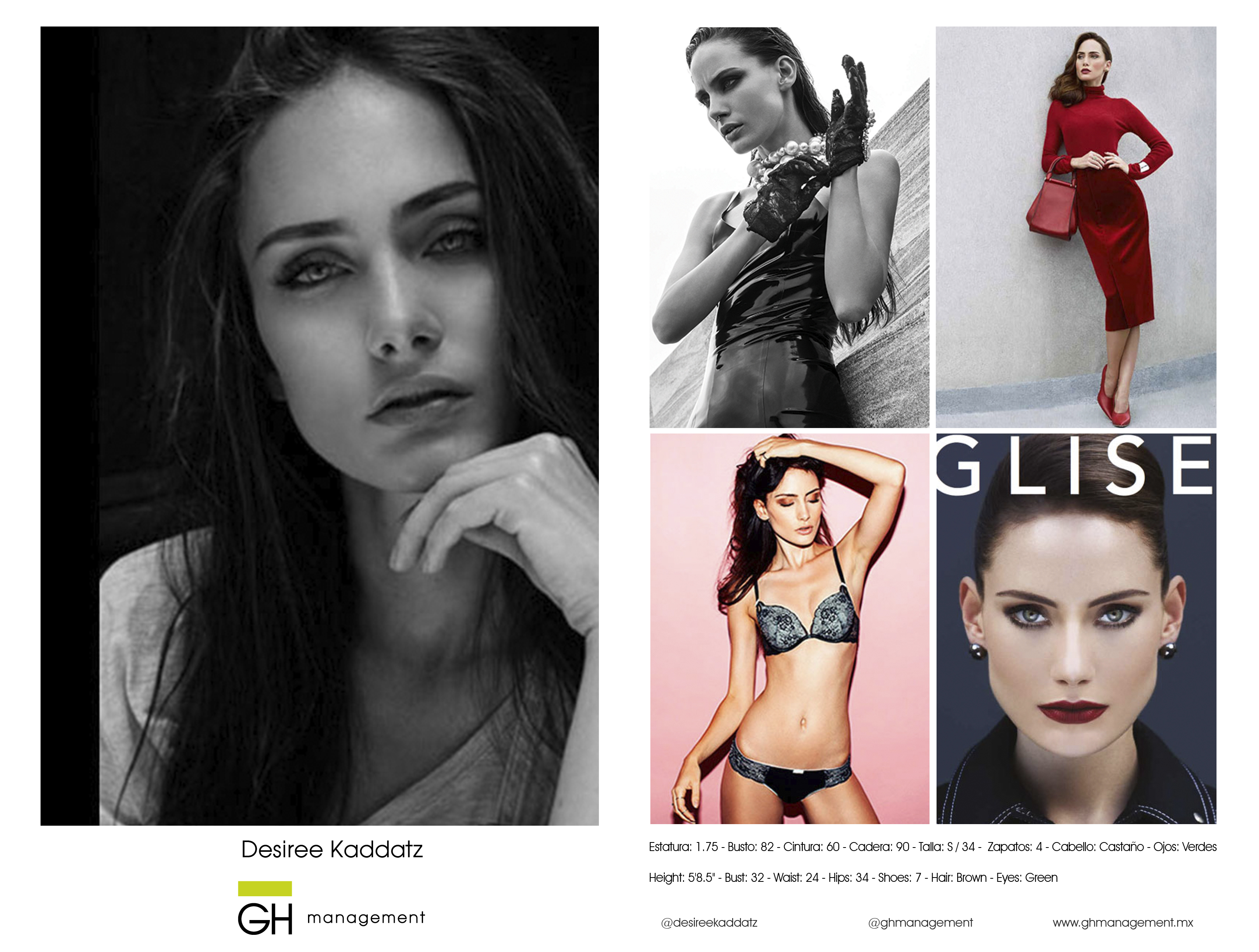 Height: 5'8.5'' - Bust: 32 - Waist: 24 - Hips: 34 - Shoes: 7 - Hair: Brown - Eyes: Green