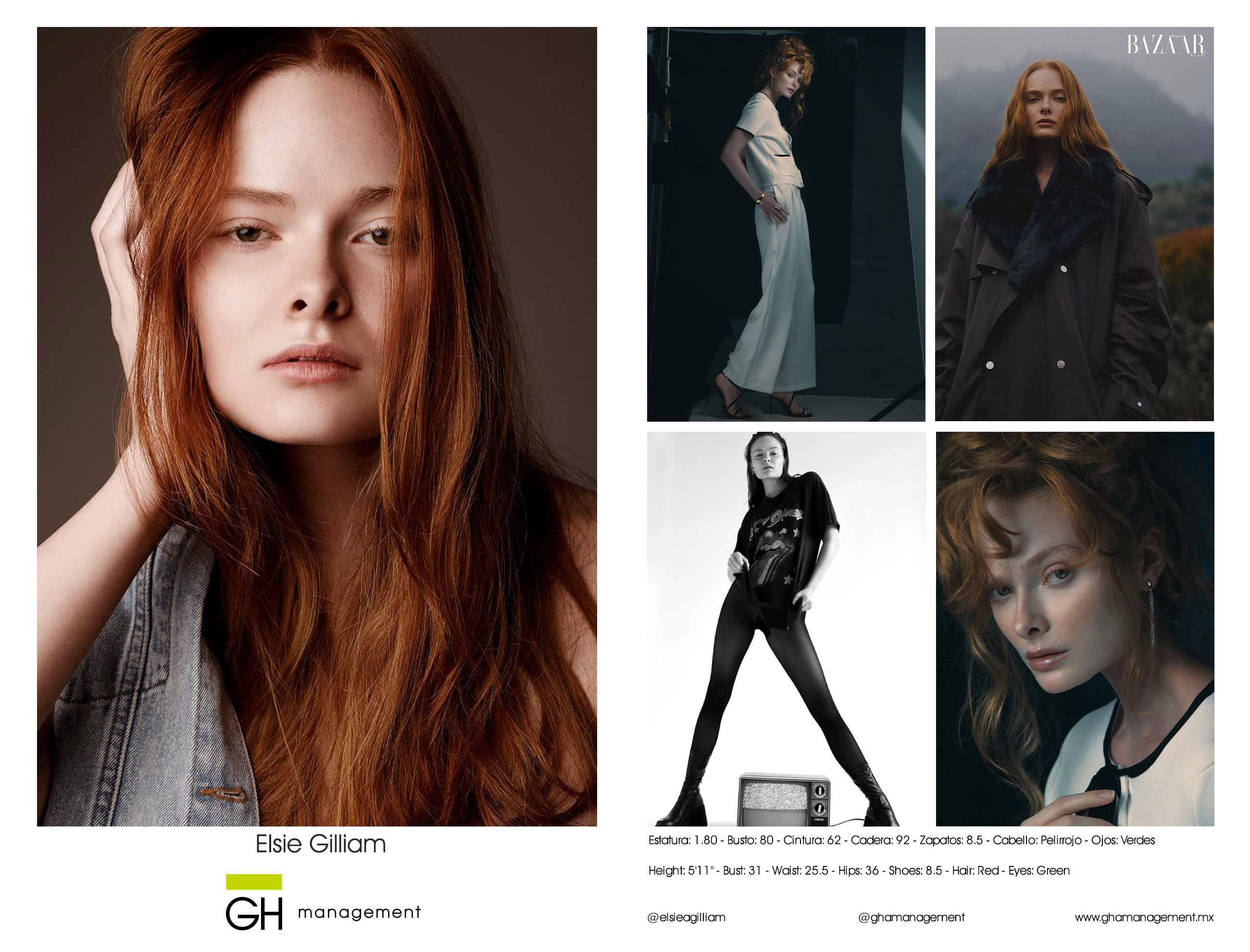 Estatura: 1.80 - Busto: 80 - Cintura: 62 - Cadera: 92 - Zapatos: 8.5 - Cabello: Pelirrojo - Ojos: Verdes