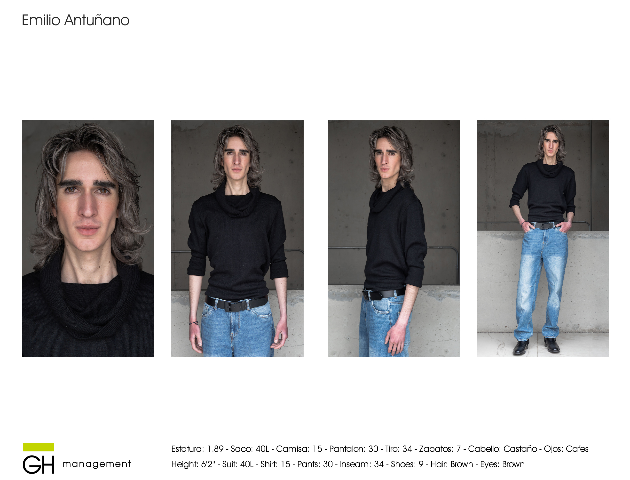 Estatura: 1.89 - Saco: 40L - Camisa: 15 - Pantalon: 30 - Tiro: 34 - Zapatos: 7 - Cabello: Castaño - Ojos: Cafes