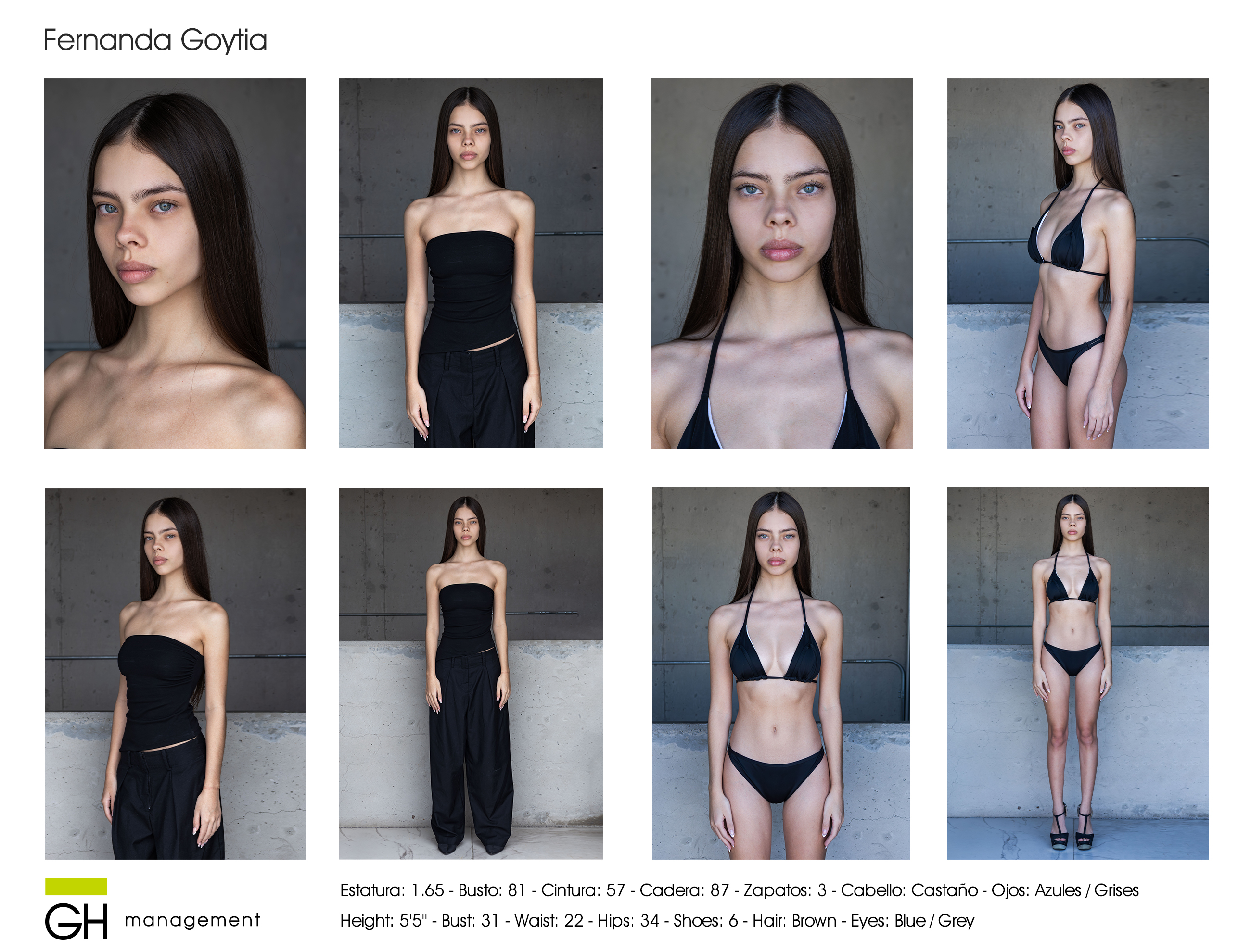 Estatura: 1.65 - Busto: 81 - Cintura: 57 - Cadera: 87 - Zapatos: 3 - Cabello: CastaƱo - Ojos: Azules / Grises