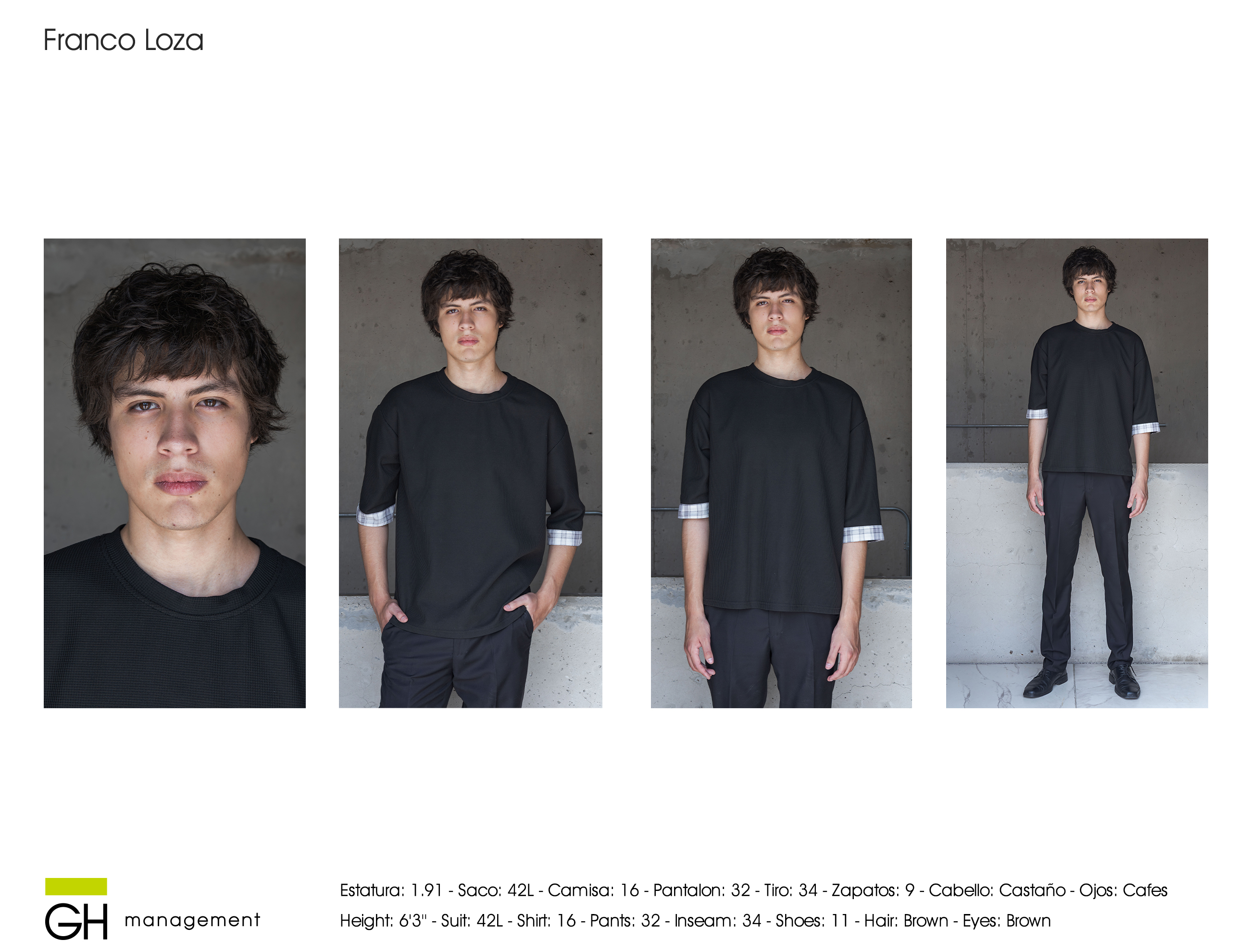 Estatura: 1.91 - Saco: 42L - Camisa: 16 - Pantalon: 32 - Tiro: 34 - Zapatos: 9 - Cabello: CastaƱo - Ojos: Cafes