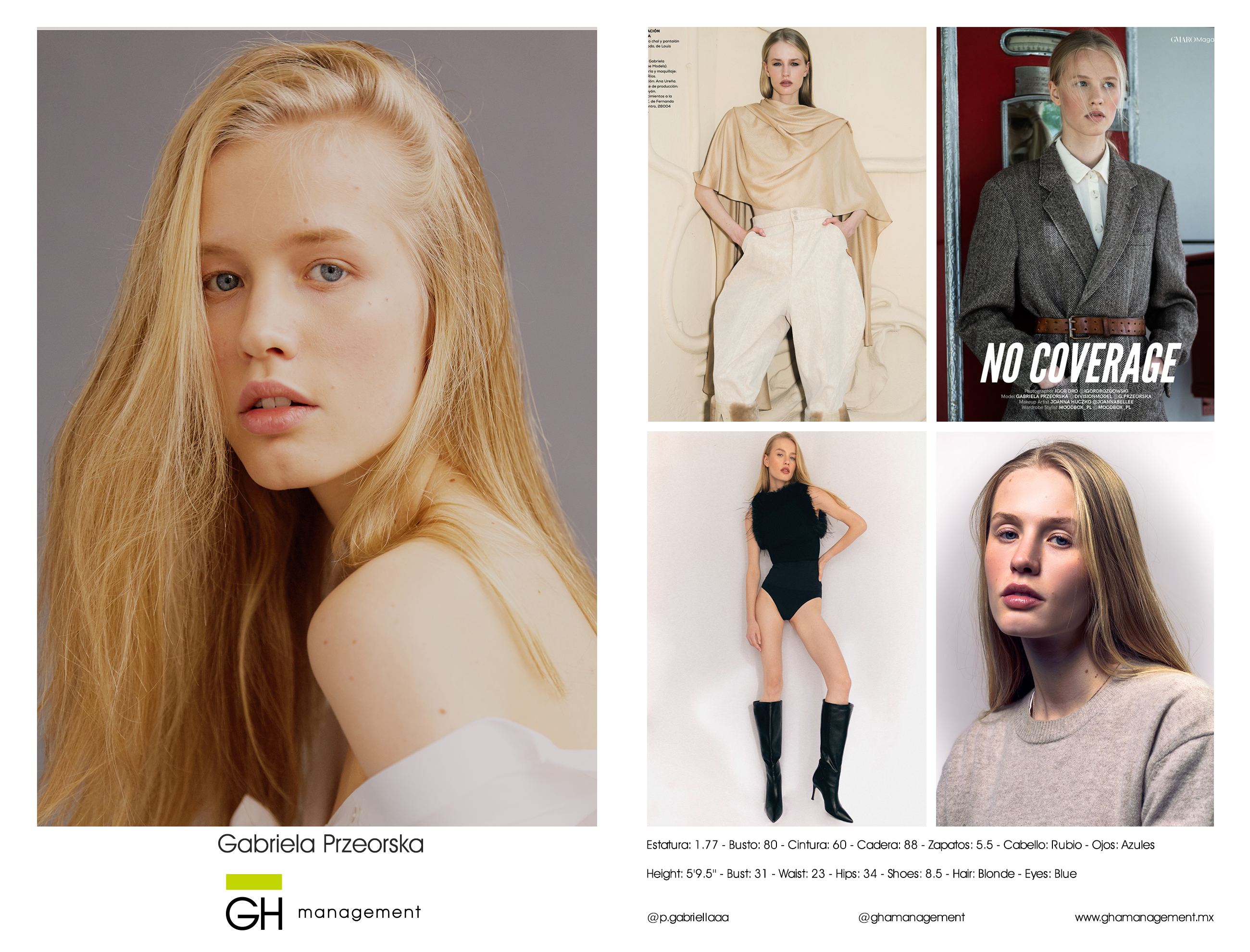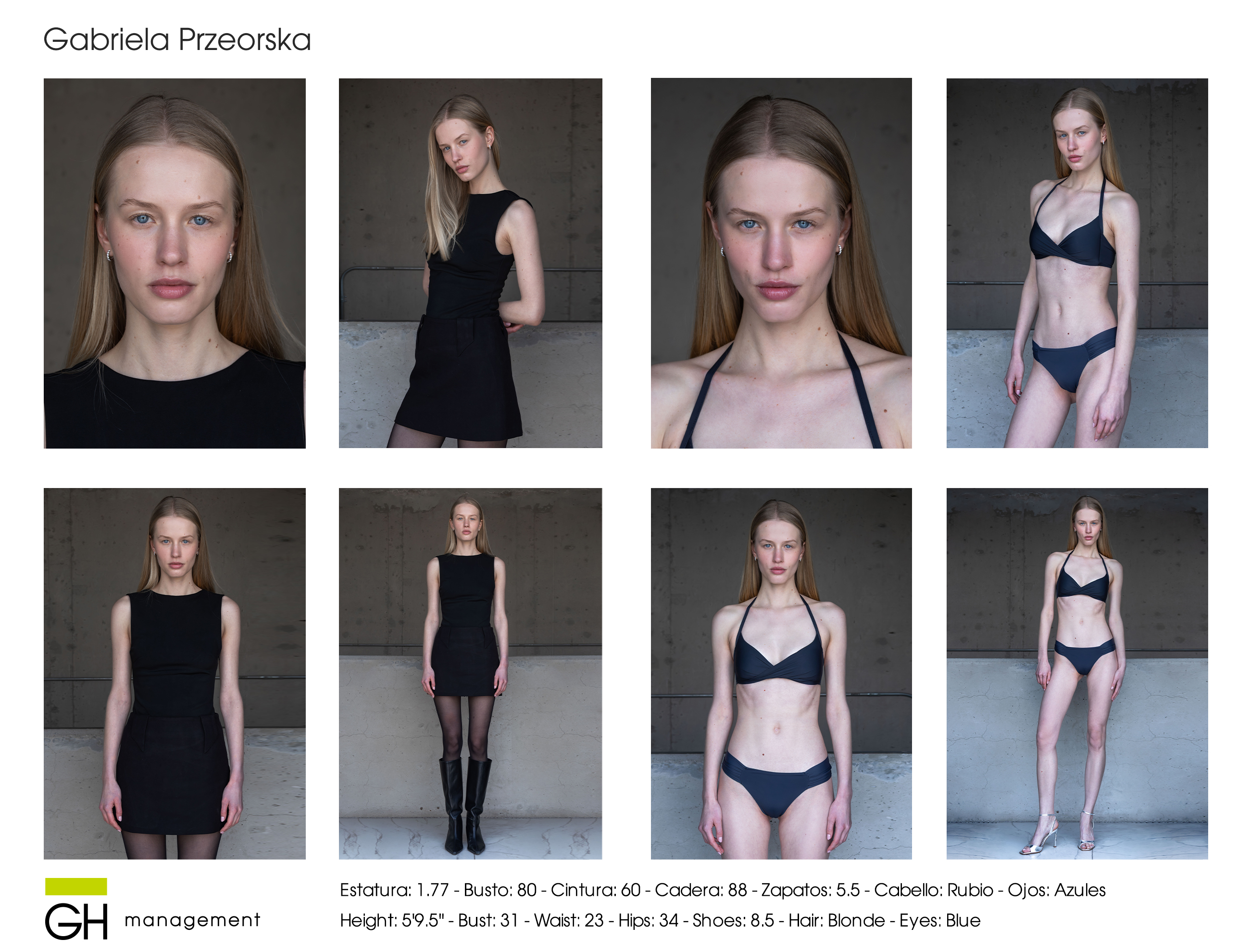 Estatura: 1.77 - Busto: 80 - Cintura: 60 - Cadera: 88 - Zapatos: 5.5 - Cabello: Rubio - Ojos: Azules