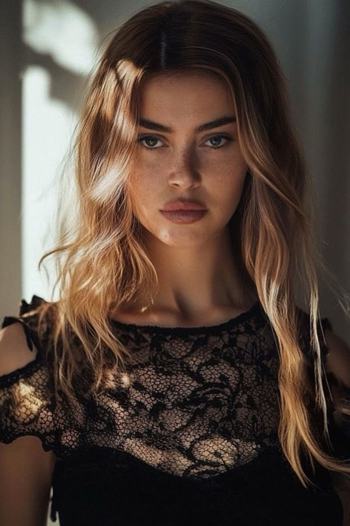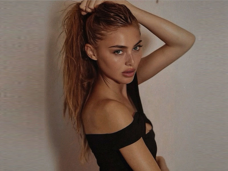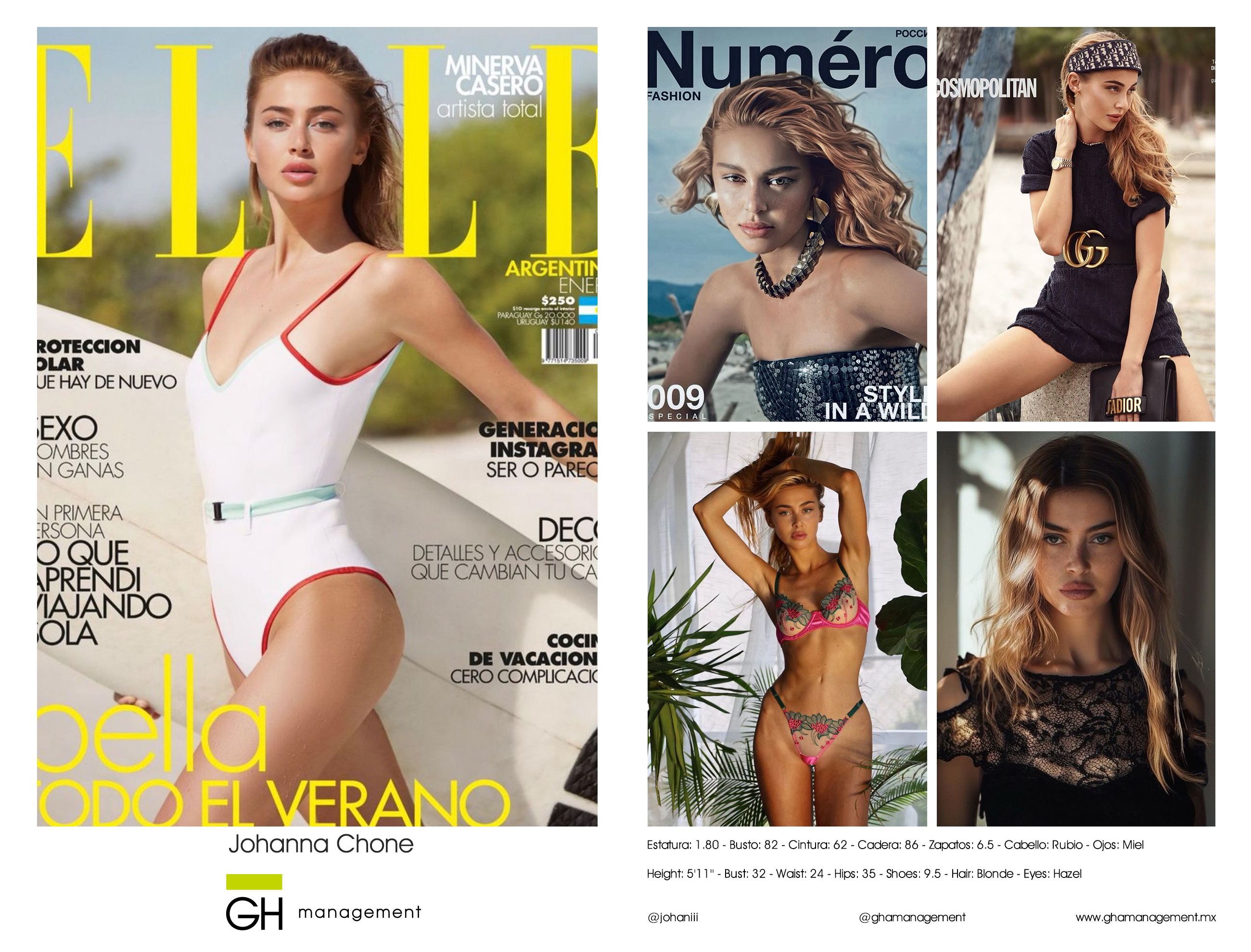 Estatura: 1.80 - Busto: 82 - Cintura: 62 - Cadera: 86 - Zapatos: 6.5 - Cabello: Rubio - Ojos: Miel