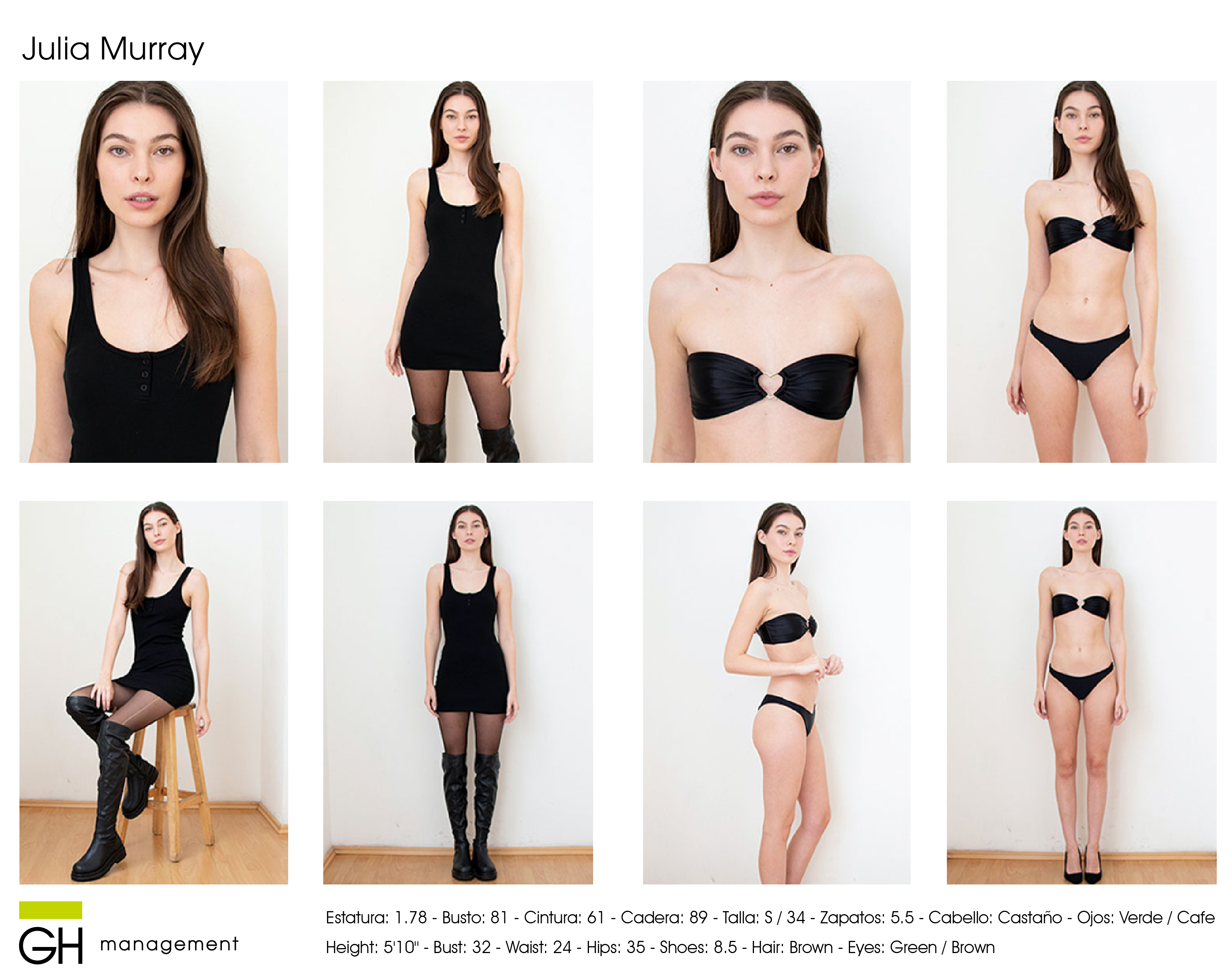 Height: 5'10'' - Bust: 32 - Waist: 24 - Hips: 35 - Shoes: 8.5 - Hair: Brown - Eyes: Green / Brown
