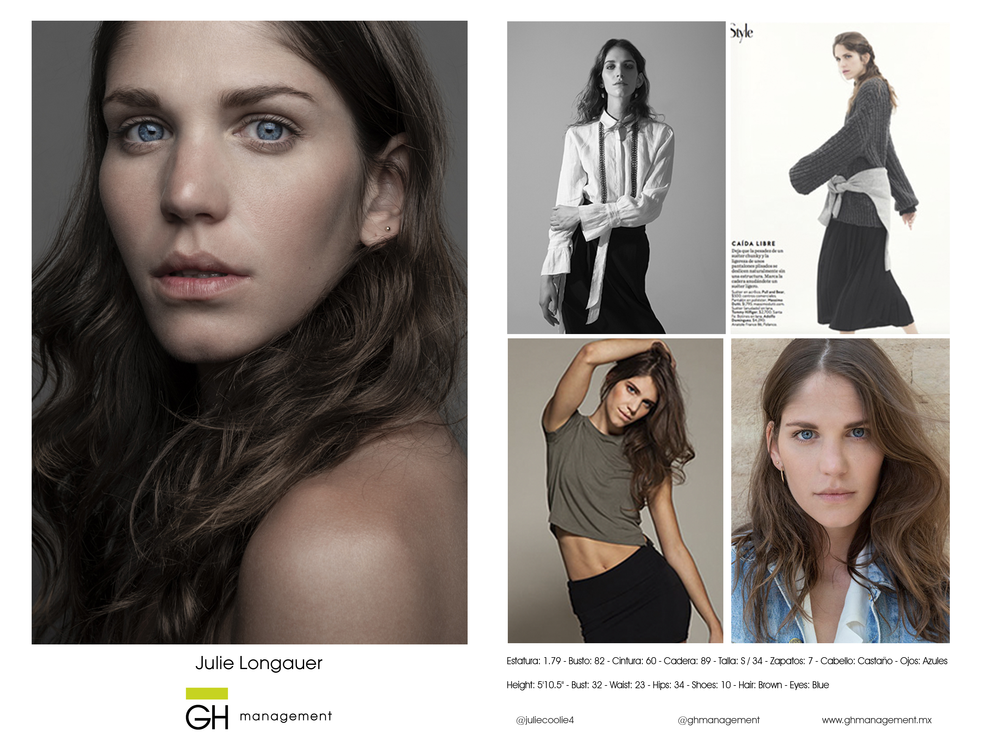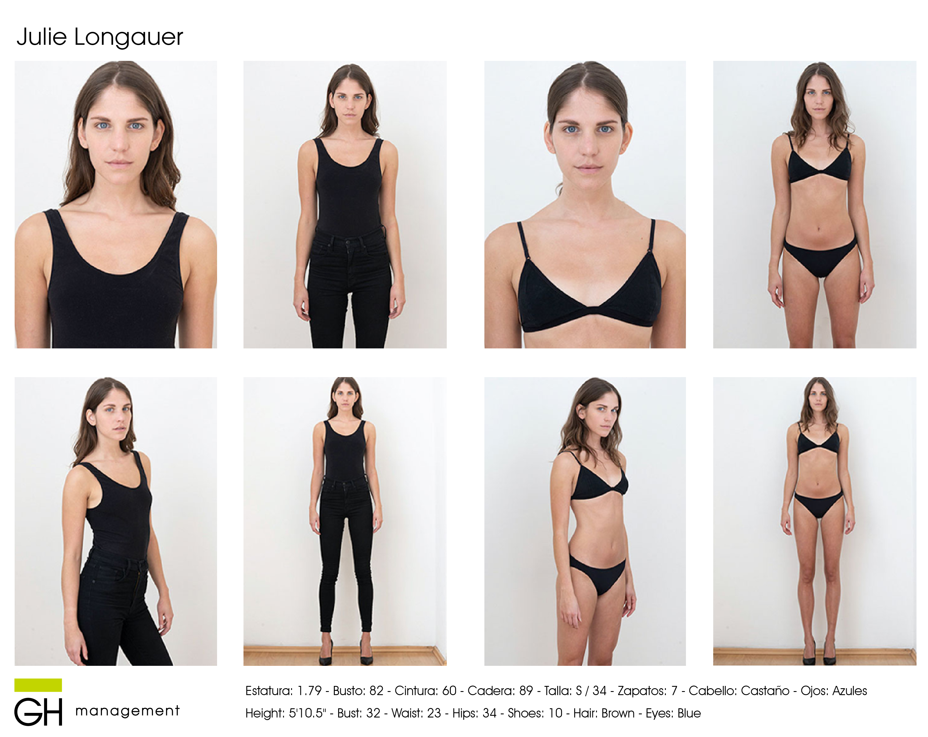 Estatura: 1.79 - Busto: 82 - Cintura: 60 - Cadera: 89 - Zapatos: 7 - Cabello: CastaƱo - Ojos: Azules