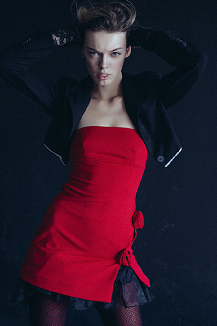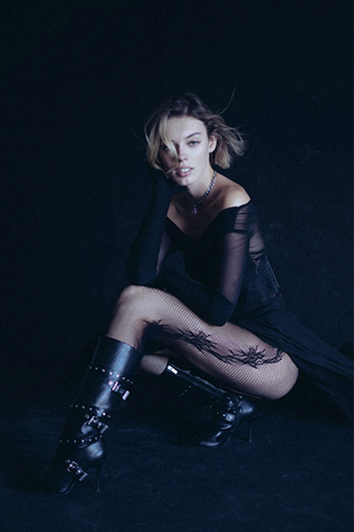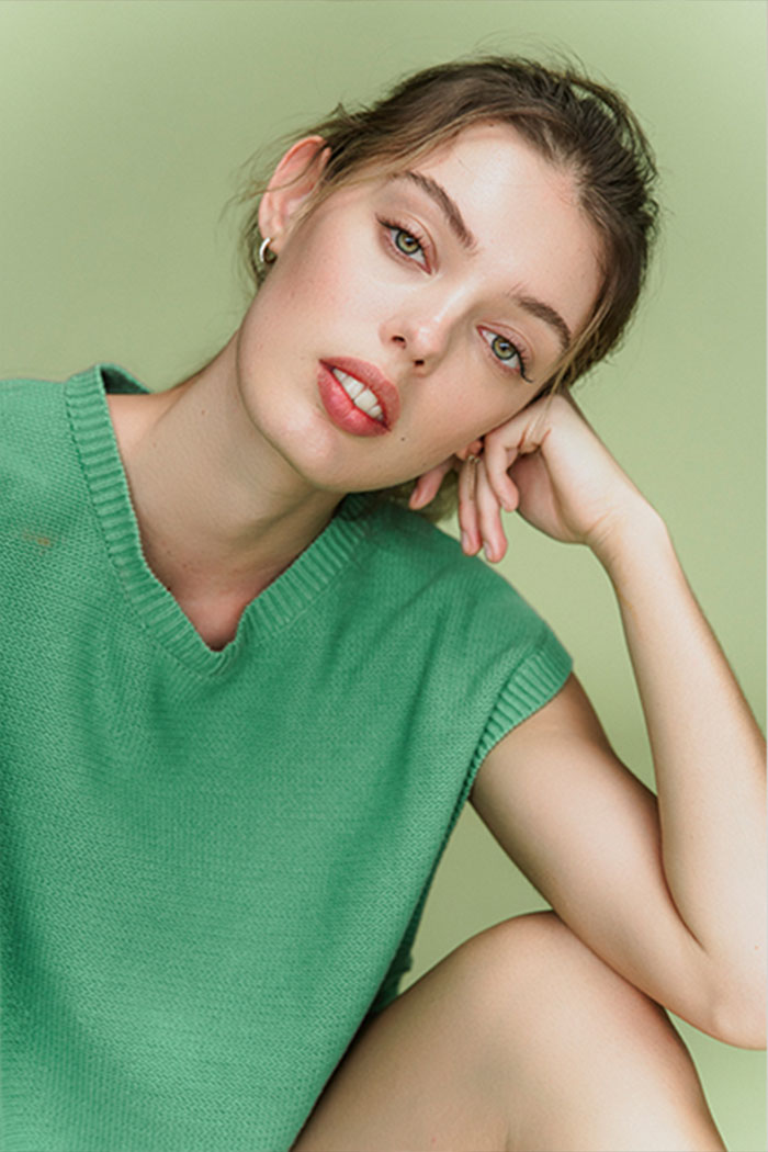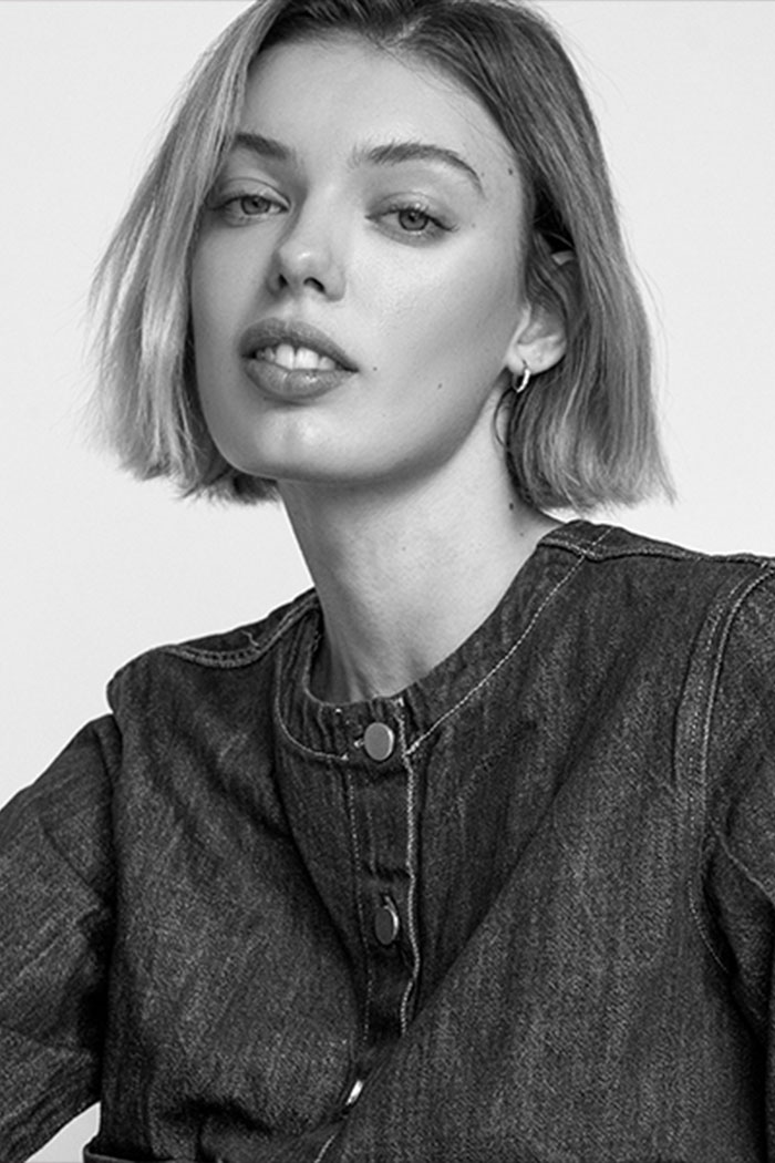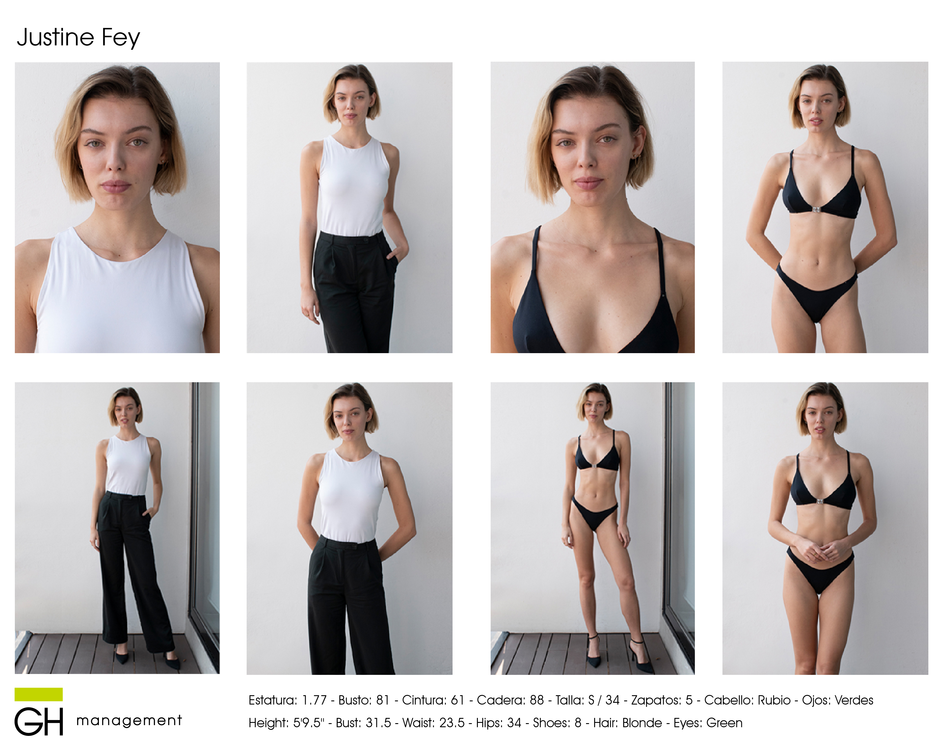 Estatura: 1.77 - Busto: 81 - Cintura: 61 - Cadera: 88 - Zapatos: 5 - Cabello: Rubio - Ojos: Verdes