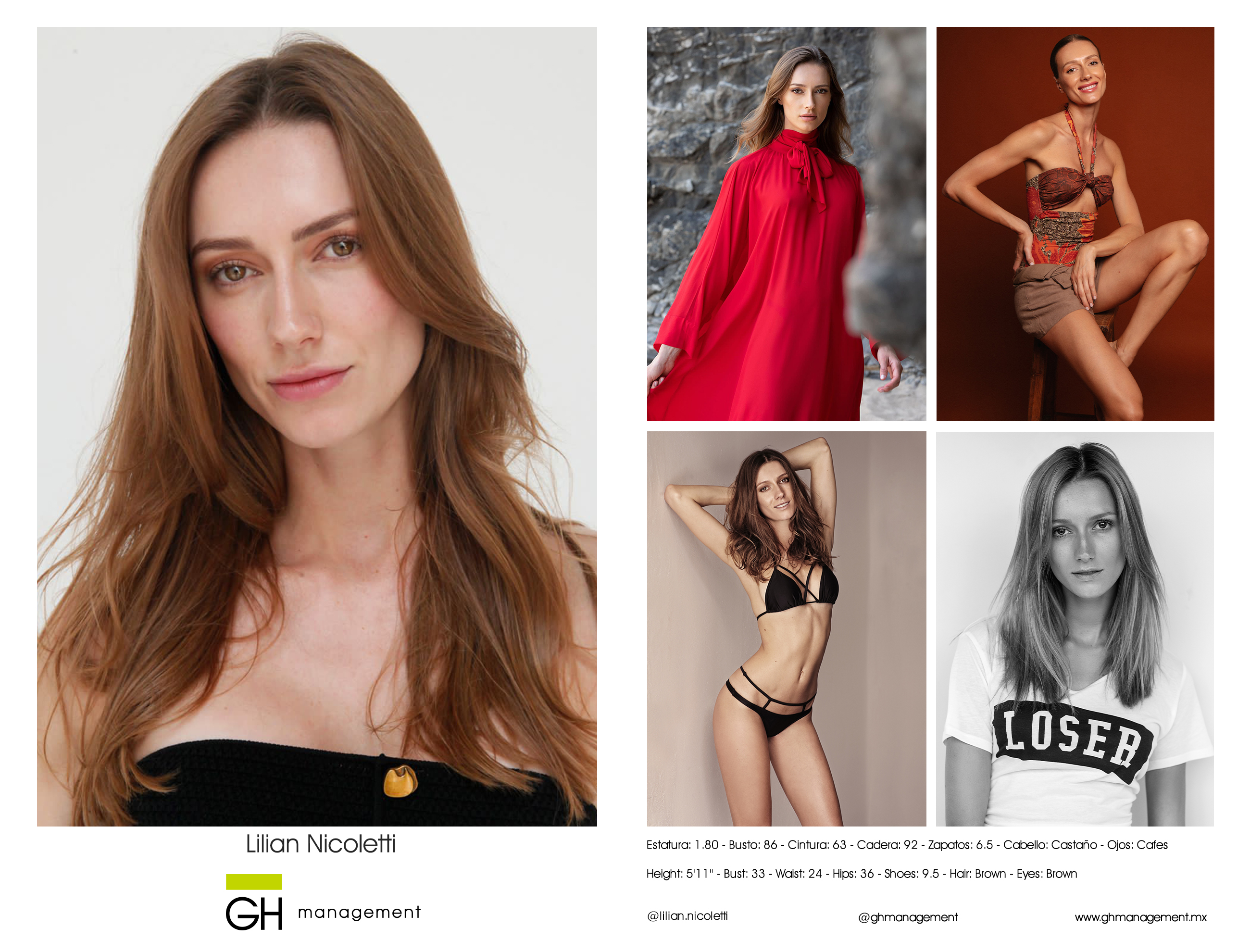 Height: 5'11'' - Bust: 33 - Waist: 24 - Hips: 36 - Shoes: 9.5 - Hair: Brown - Eyes: Brown