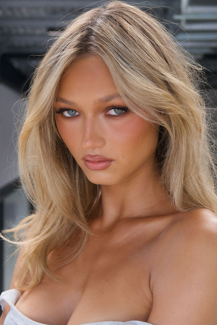 Estatura: 1.75 - Busto: 81 - Cintura: 57 - Cadera: 86 - Zapatos: 5 - Cabello: Rubio - Ojos: Verdes