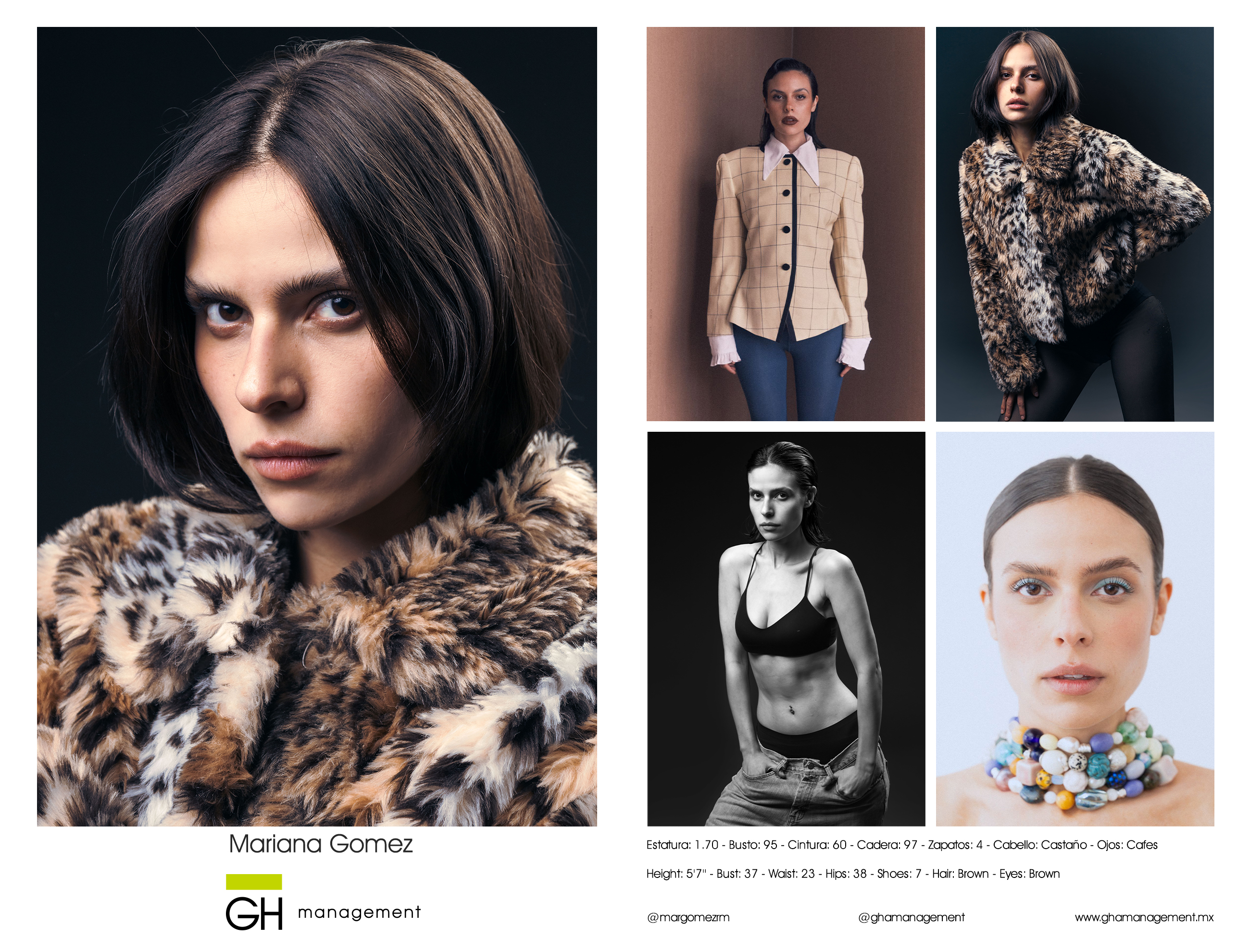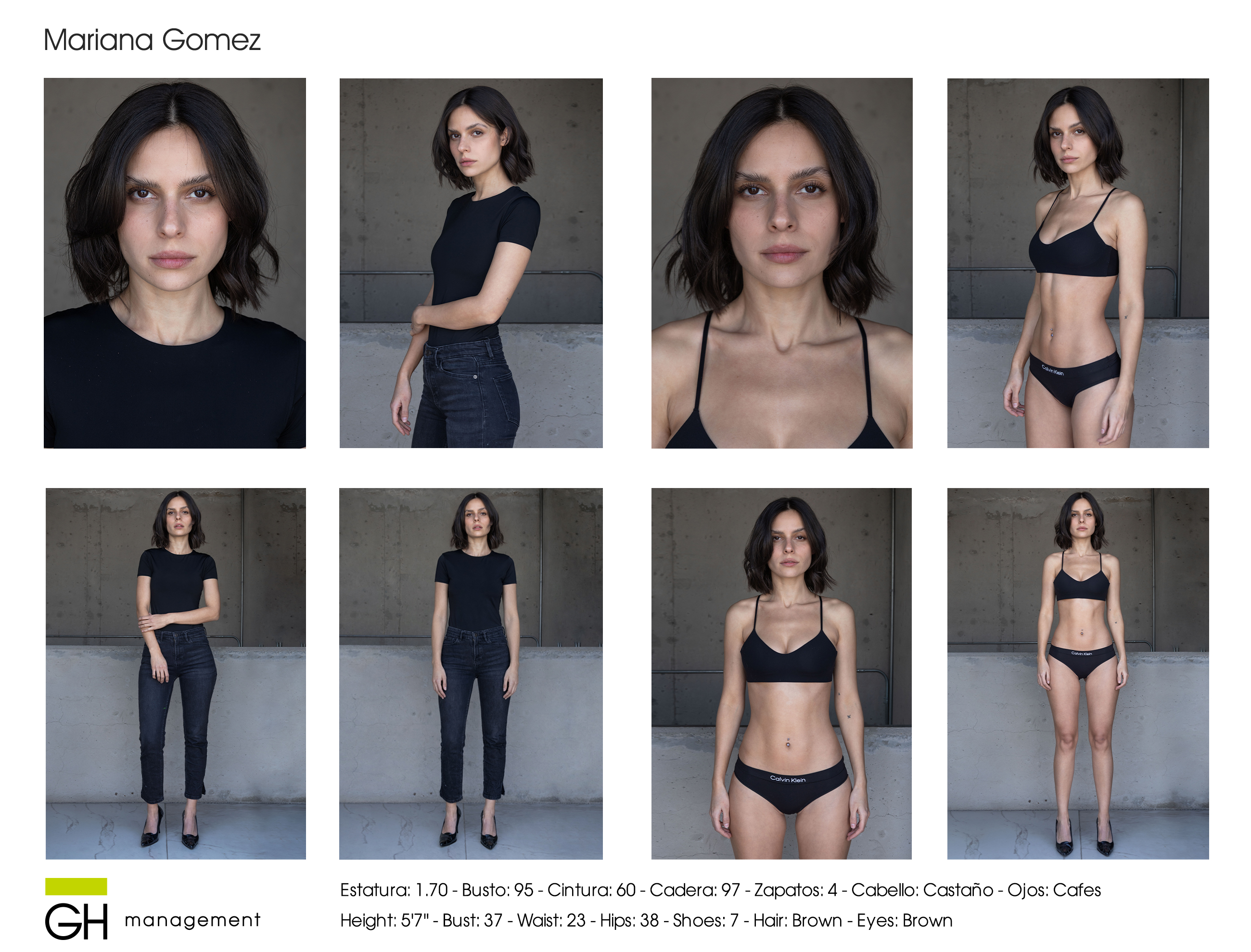 Height: 5'7'' - Bust: 37 - Waist: 23 - Hips: 38 - Shoes: 7 - Hair: Brown - Eyes: Brown