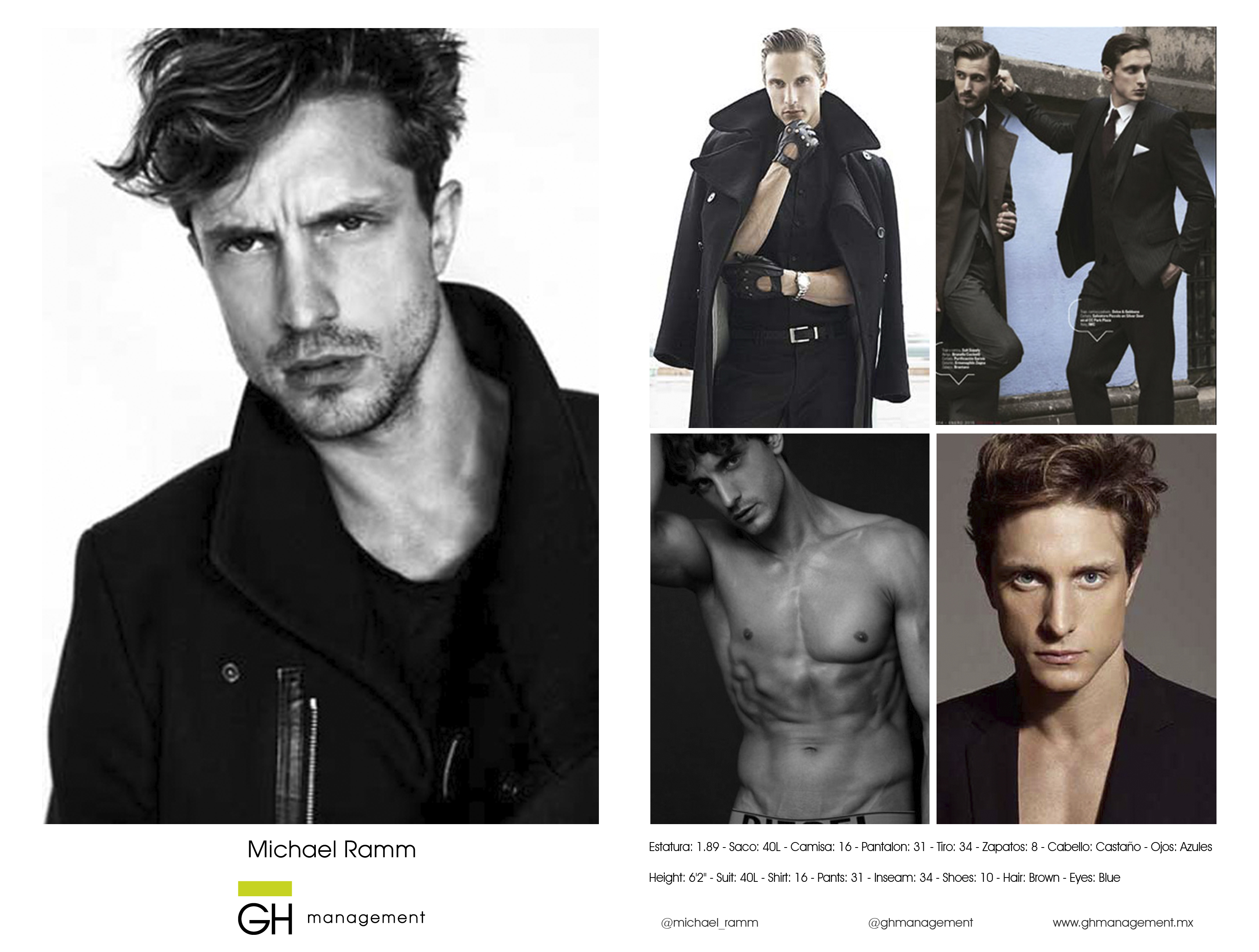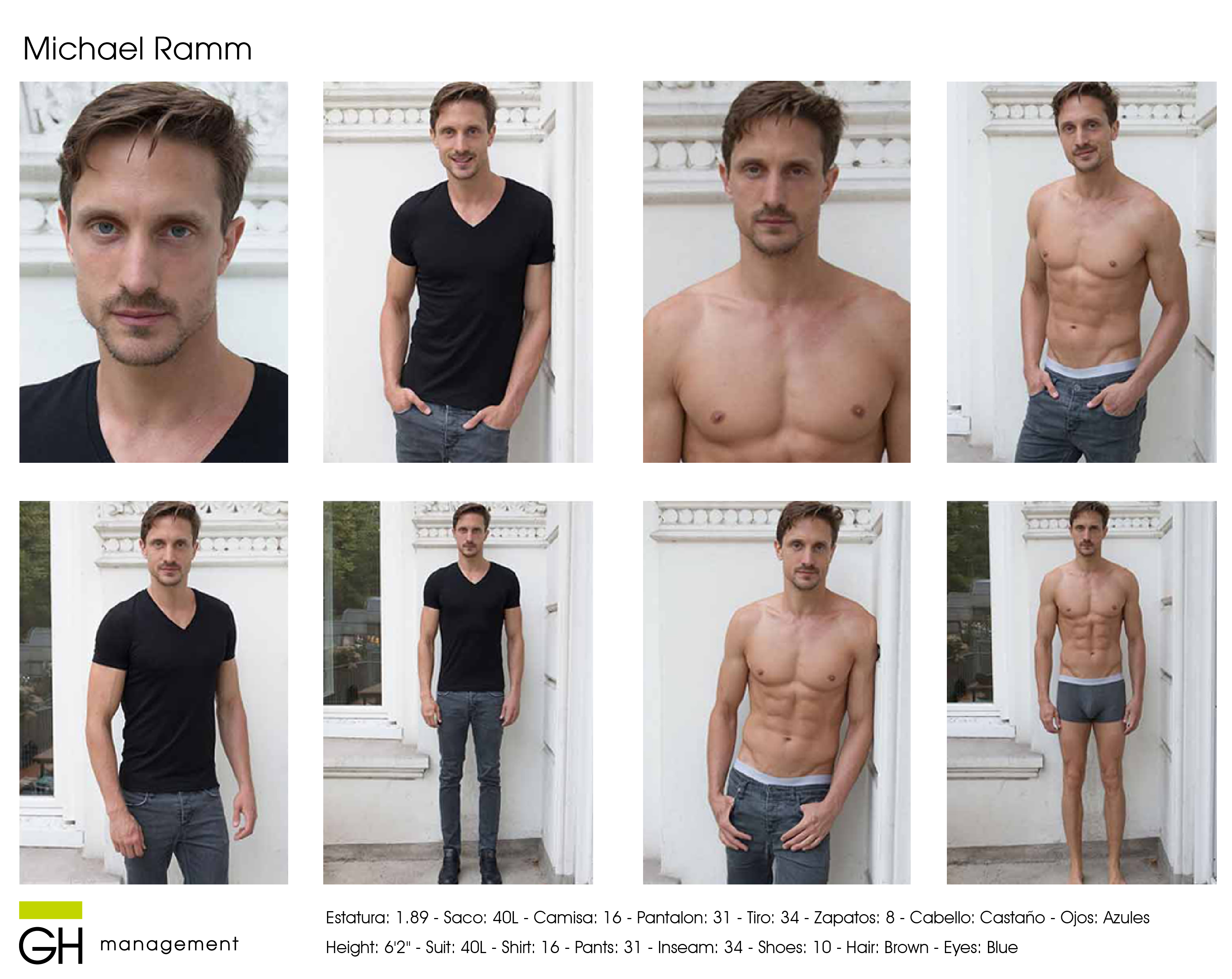 Estatura: 1.89 - Saco: 40L - Camisa: 16 - Pantalon: 31 - Tiro: 34 - Zapatos: 8 - Cabello: CastaƱo - Ojos: Azules