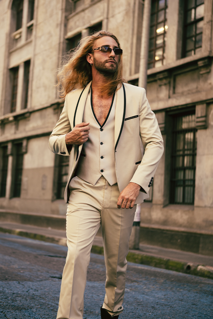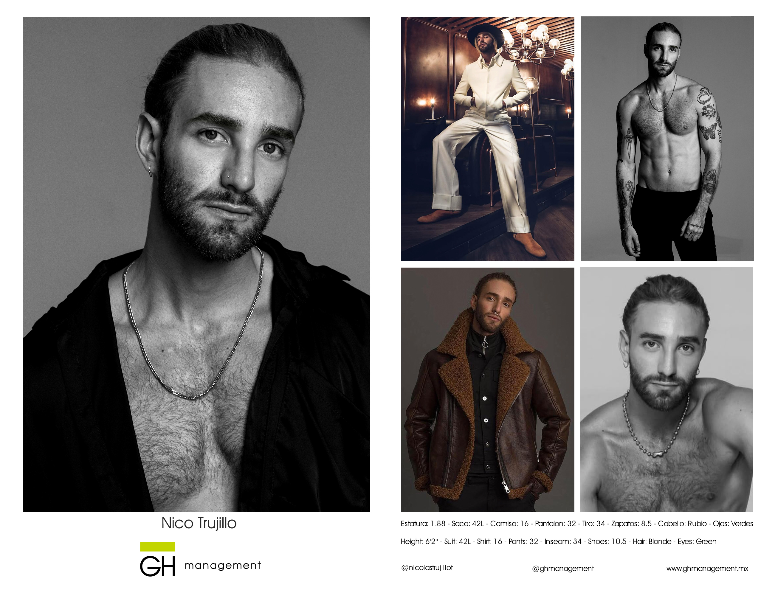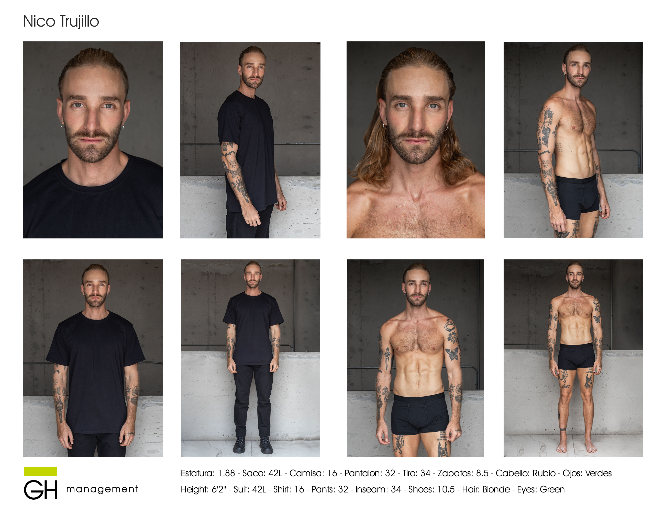 Estatura: 1.88 - Saco: 42L - Camisa: 16 - Pantalon: 32 - Tiro: 34 - Zapatos: 8.5 - Cabello: Rubio - Ojos: Verdes