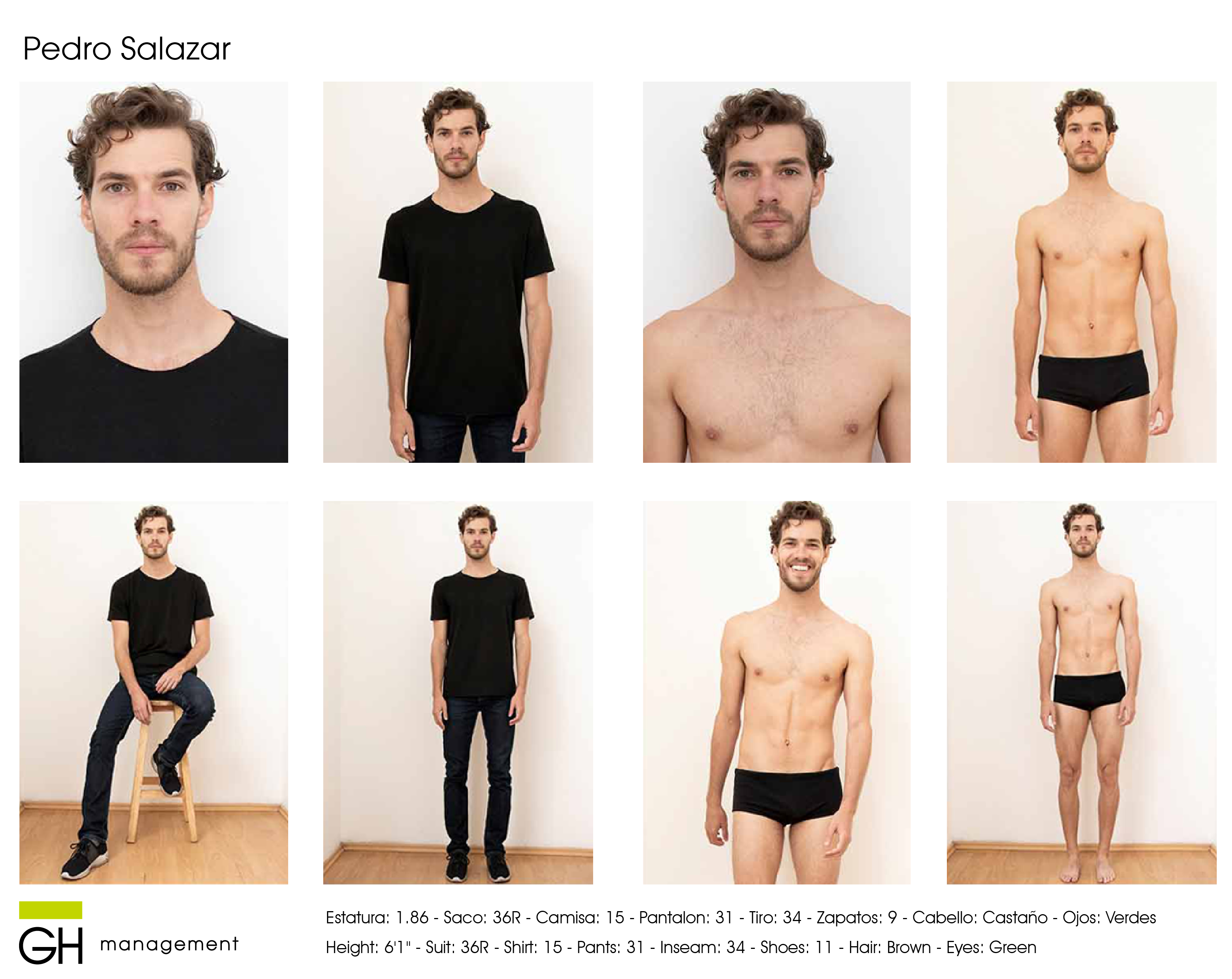 Estatura: 1.86 - Saco: 36R - Camisa: 15 - Pantalon: 31 - Tiro: 34 - Zapatos: 9 - Cabello: CastaƱo - Ojos: Verdes