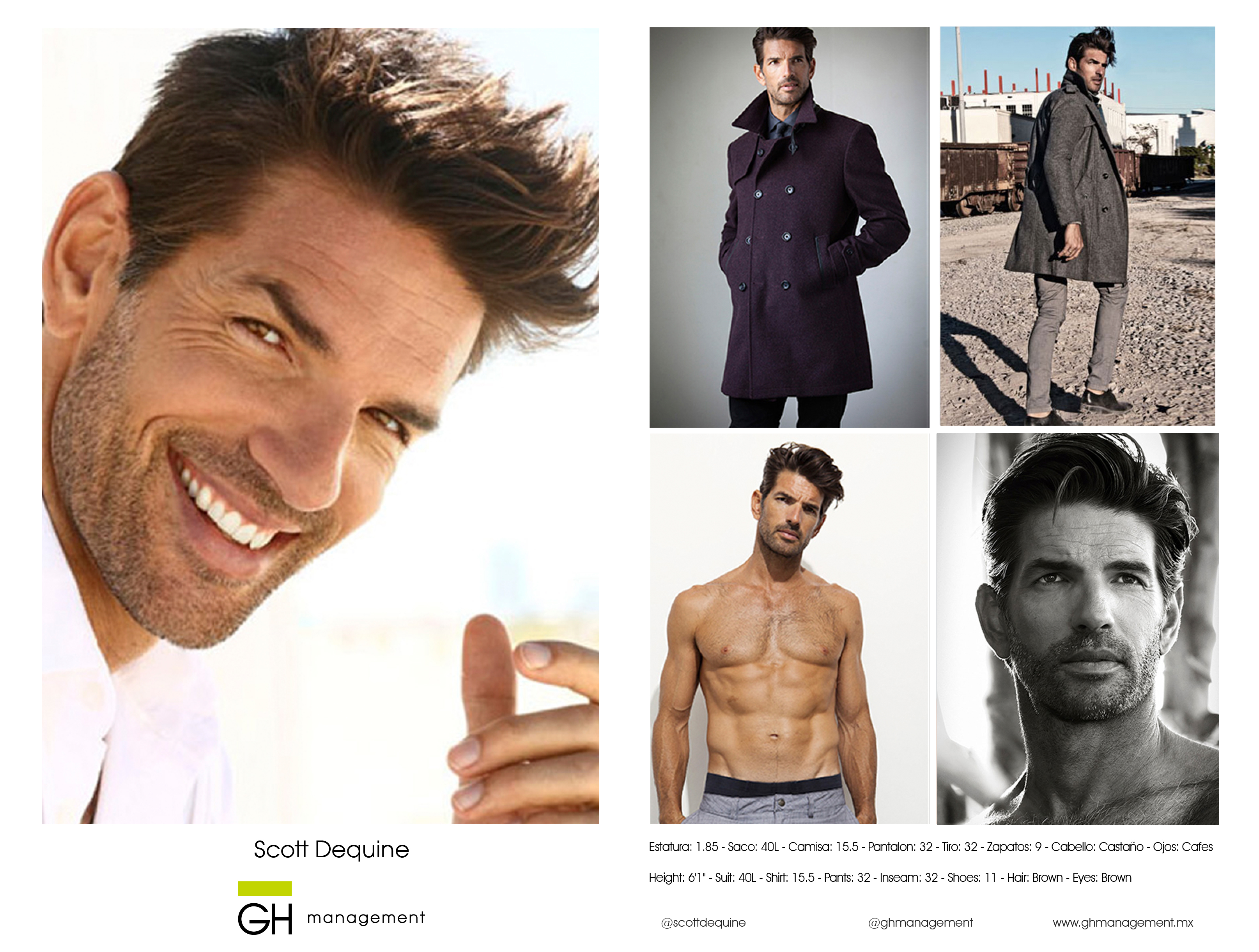 Estatura: 1.85 - Saco: 40L - Camisa: 15.5 - Pantalon: 32 - Tiro: 32 - Zapatos: 9 - Cabello: CastaƱo - Ojos: Cafes