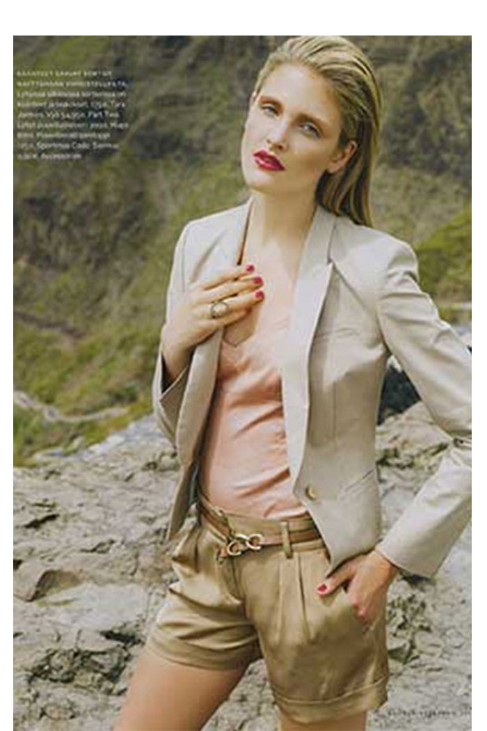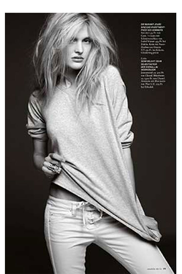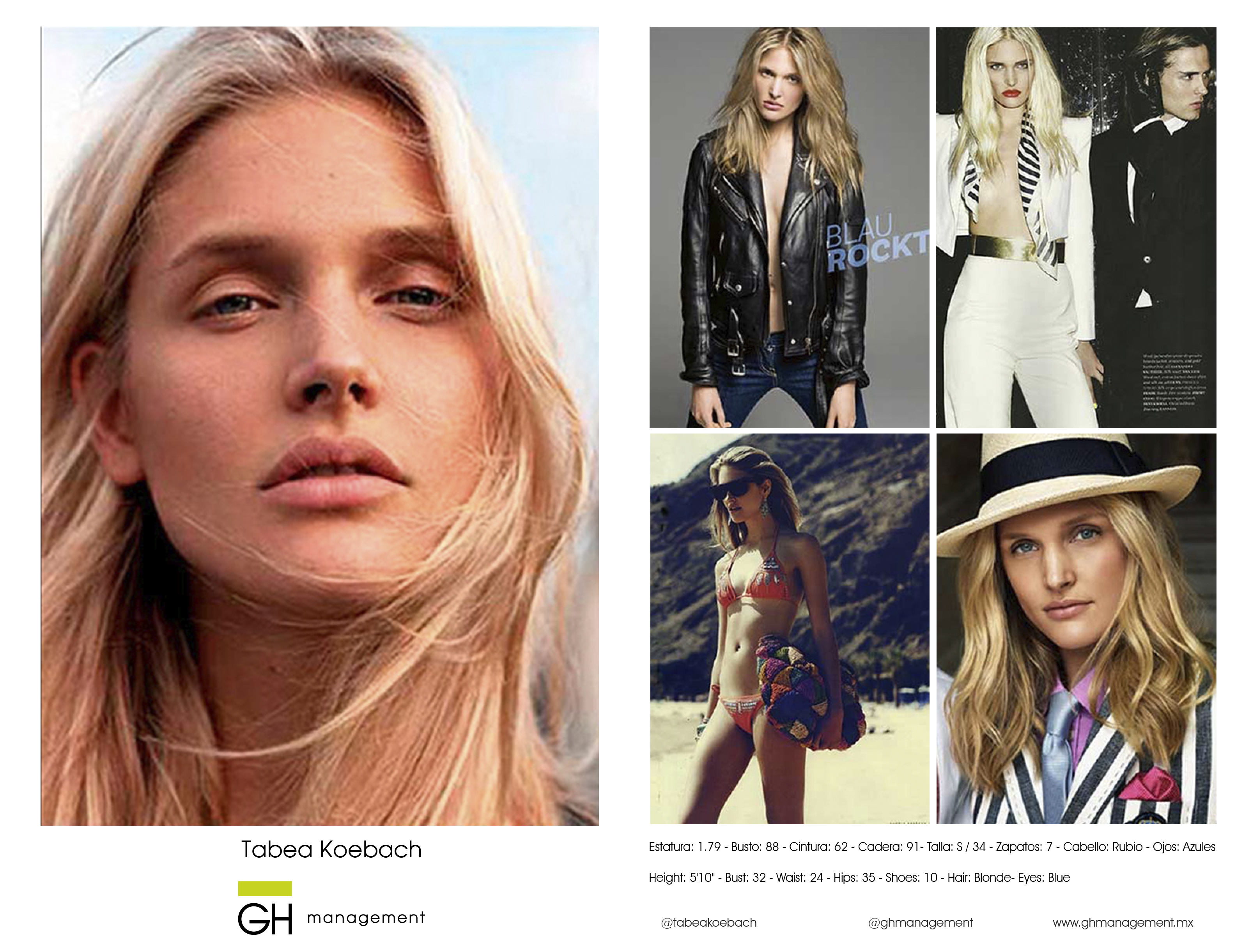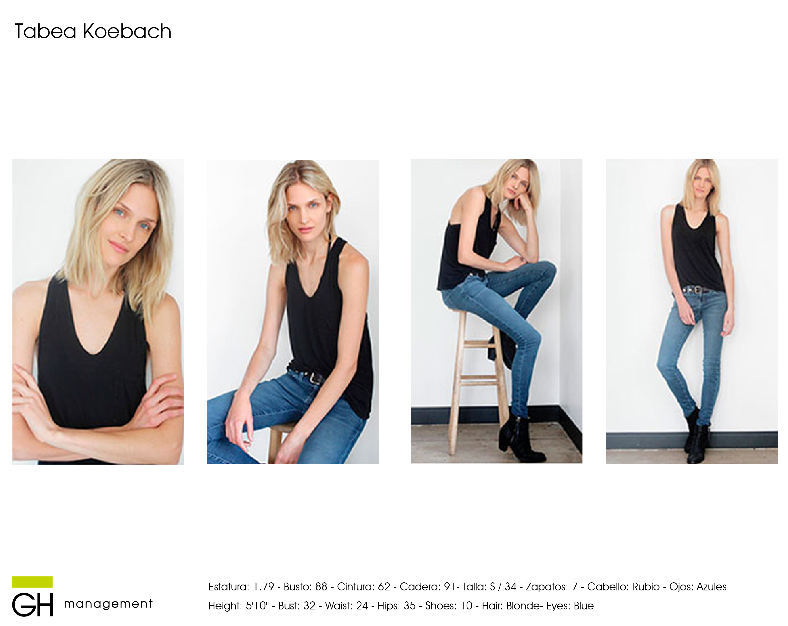 Estatura: 1.79 - Busto: 88 - Cintura: 62 - Cadera: 91 - Zapatos: 7 - Cabello: Rubio - Ojos: Azules
