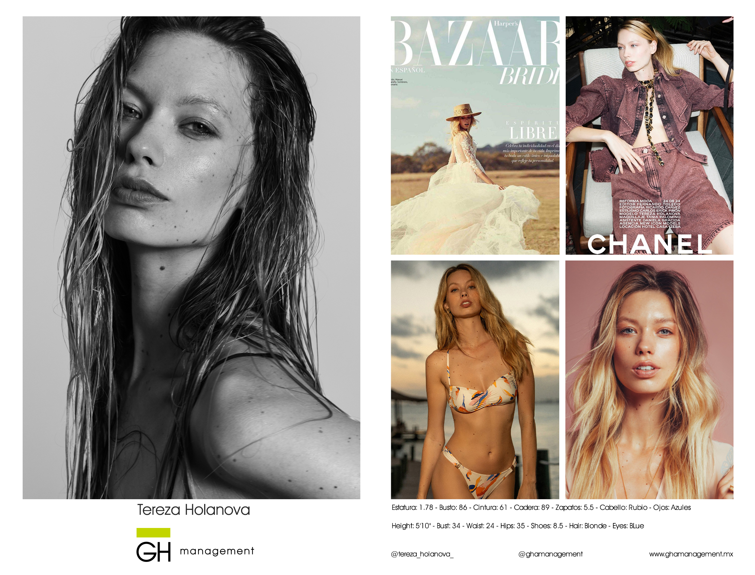 Estatura: 1.78 - Busto: 86 - Cintura: 61 - Cadera: 89 - Zapatos: 5.5 - Cabello: Rubio - Ojos: Azules
