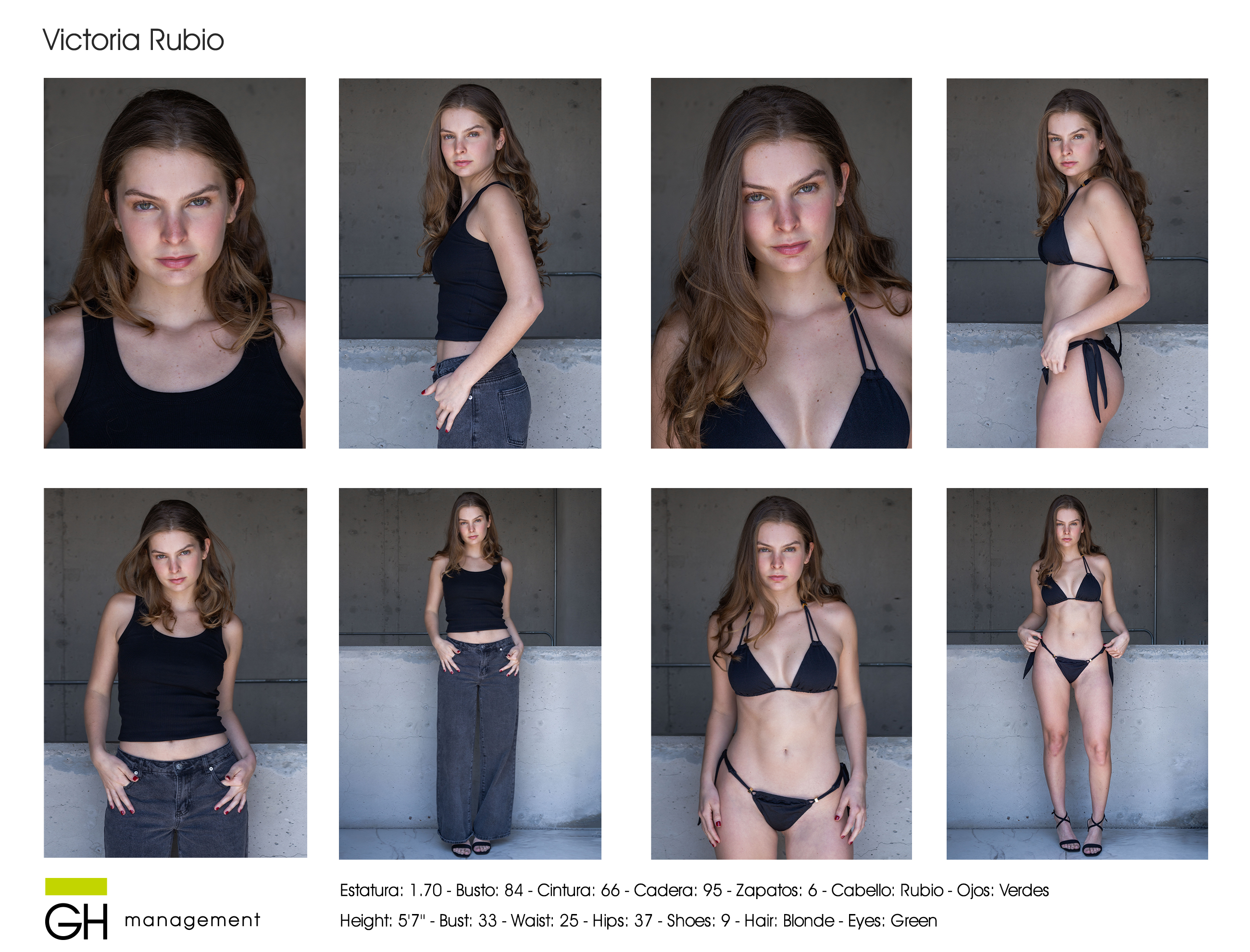 Estatura: 1.70 - Busto: 84 - Cintura: 66 - Cadera: 95 - Zapatos: 6 - Cabello: Rubio - Ojos: Verdes